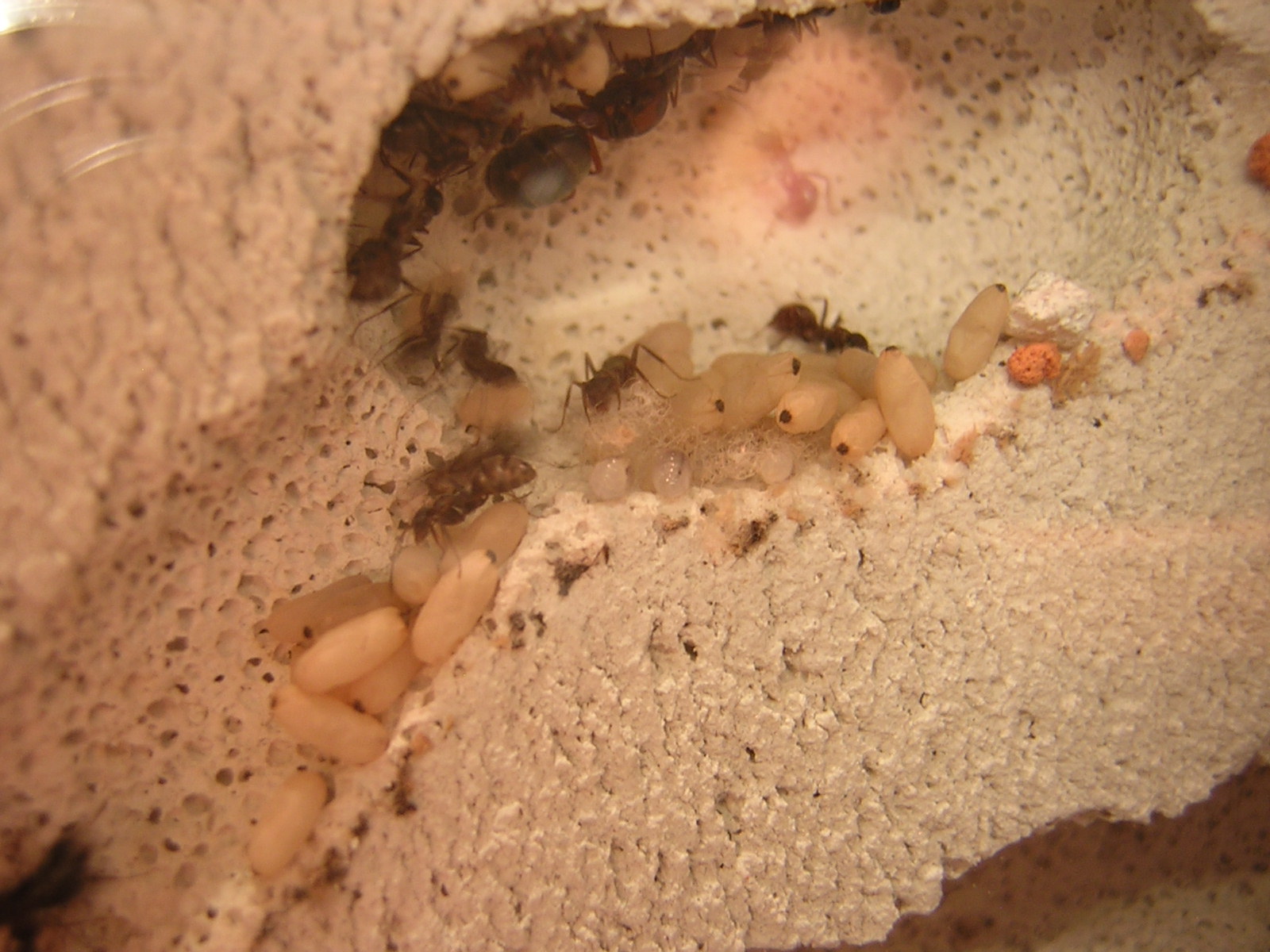 Glücklicherweise entwickelt sich sich die Kolonie ansonsten gut weiter, es sind viele Puppen vorhanden und einige Larven, Eier habe ich allerdings nicht entdecken können, was nicht weiter beunruhigend ist, da ich den Ytong nicht bewässere und sich die Eier wahrscheinlich im RG befinden werden.
