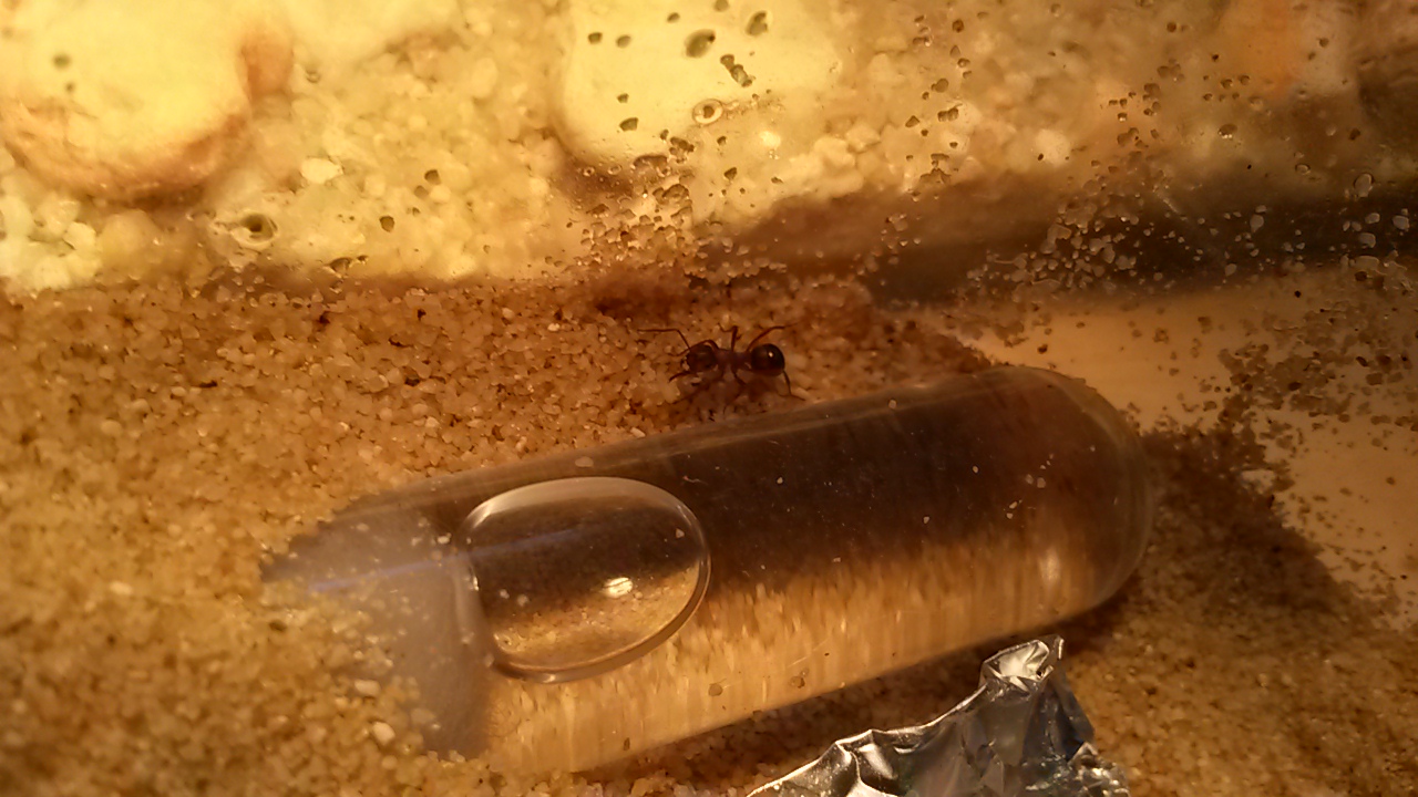 Die Kolonie ist etwa 120 Arbeiterinnen groß. Sie leben in einem RG welches in einer, nicht unbedingt, kleinen Box liegt. Das Wasser in dem Wassertank ist pink, dass kann ja normal sein, aber in der Box lagen 3-4 tote Arbeiterinnen. Daher hab ich ein zweites RG angeboten, abgedunkelt und das alte ausgegraben. (Es lag etwas zugeschüttet. Die Königin sieht sehr schön aus!