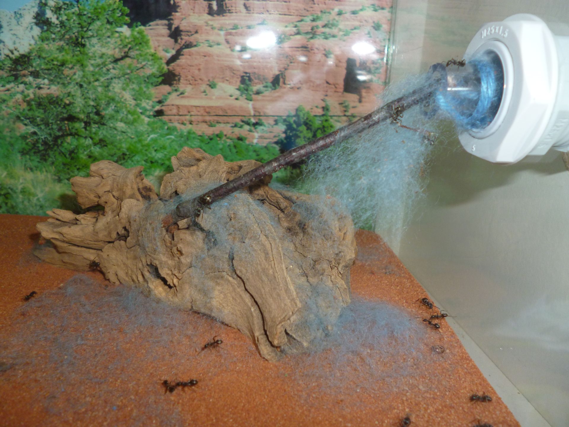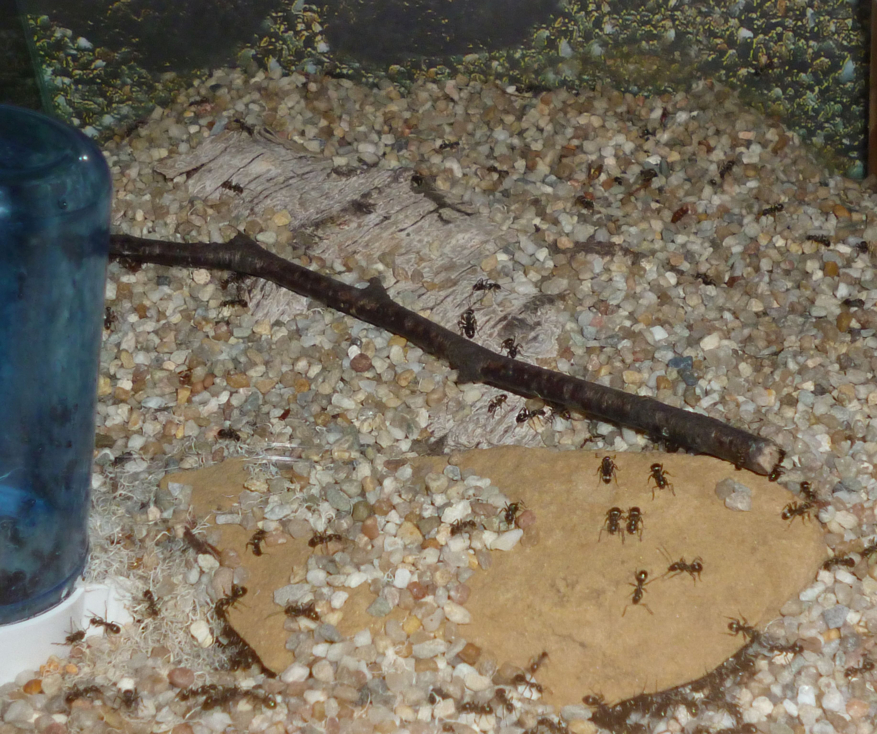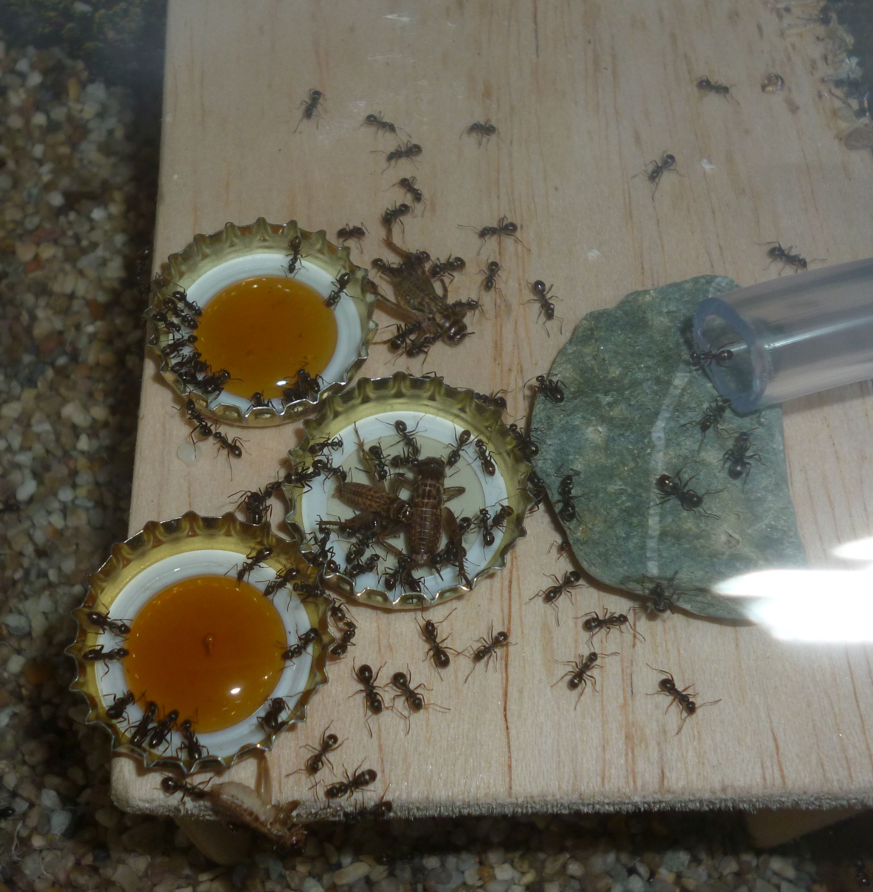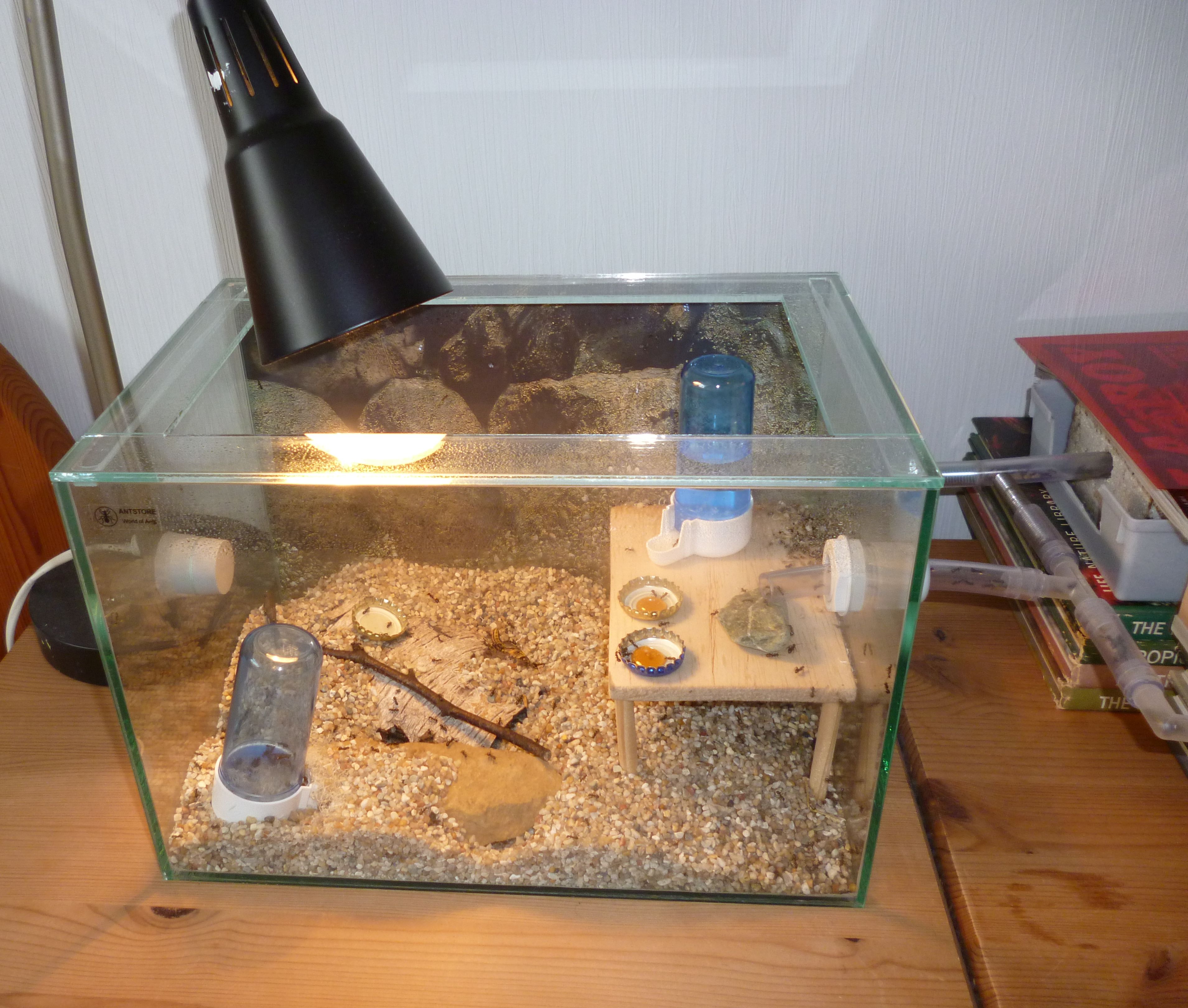 So wird nun eine runde Sache aus der ganzen Konzeption. Die Kolonie hat nun ein leicht feuchtes Ytongnest und ein beheiztes, trockenes Holznest zur Verfügung. In der Arena haben sie auch noch ihre selbstgebauten Nestanlagen unter der Rinde und im trocken gelegten Wasserspender. Ach ja, nicht zu vergessen die Schlauchverbindungen, diese sind stets gut besetzt mit Arbeiterinnen und