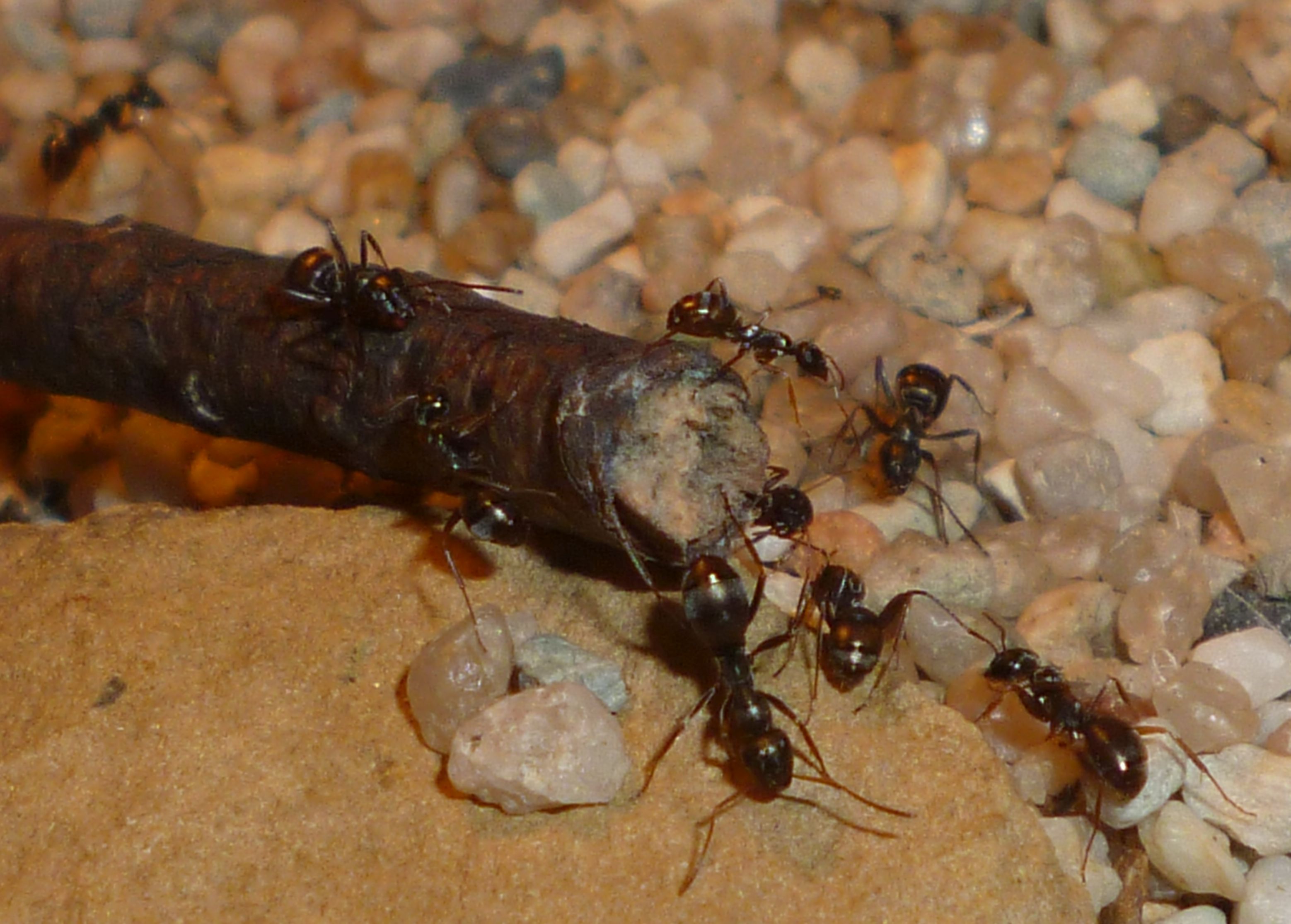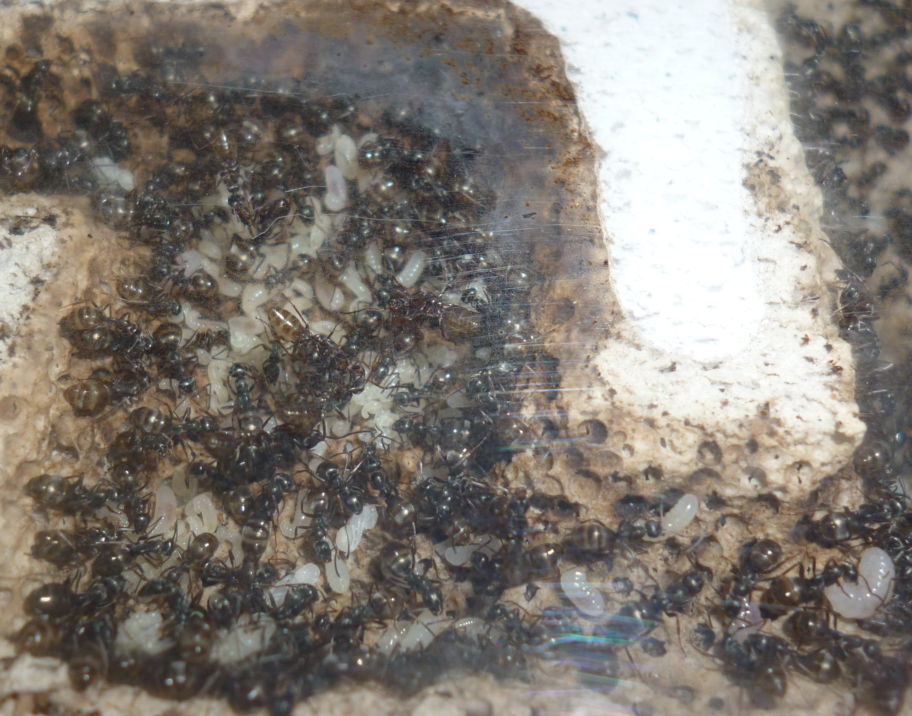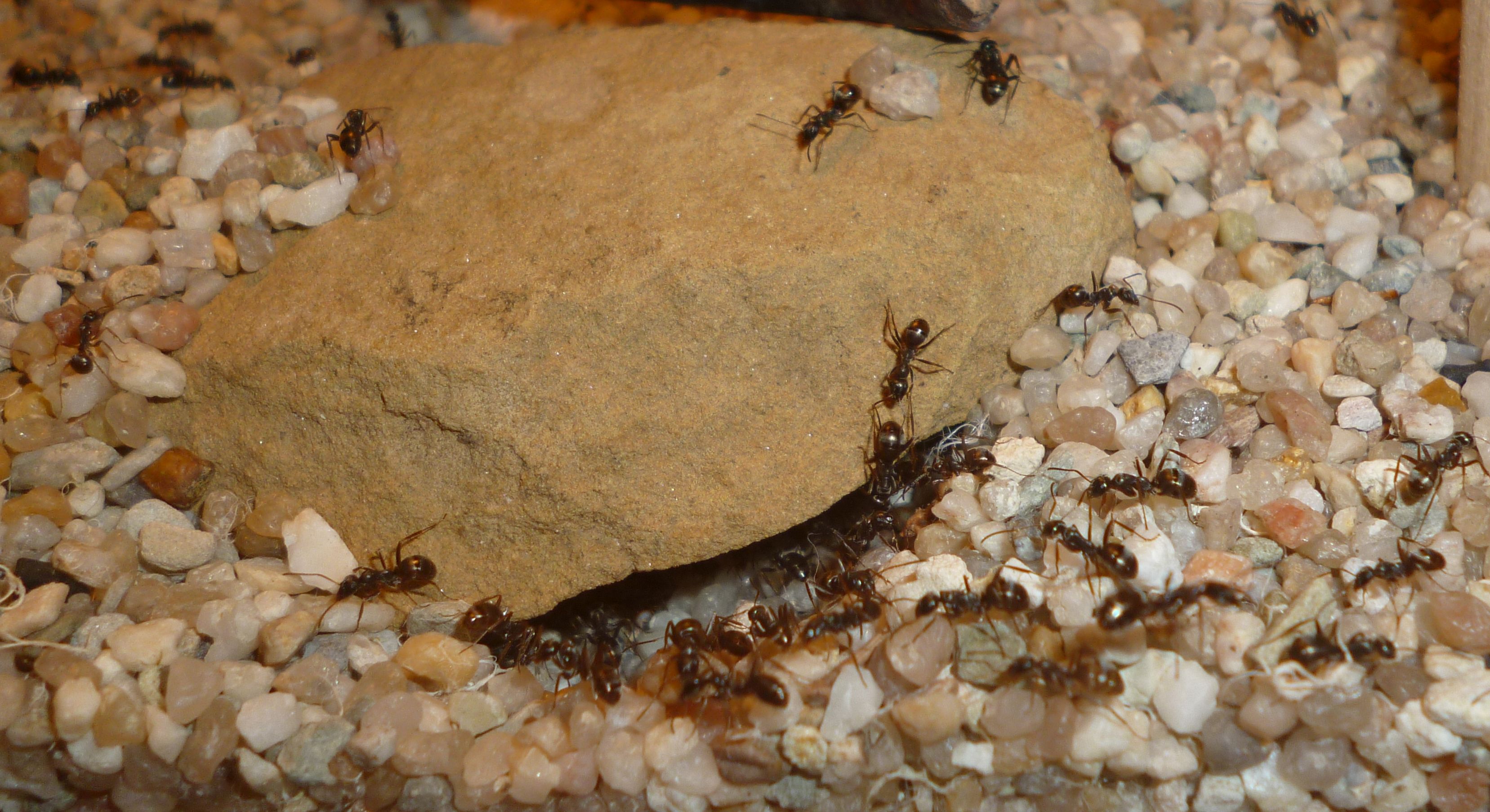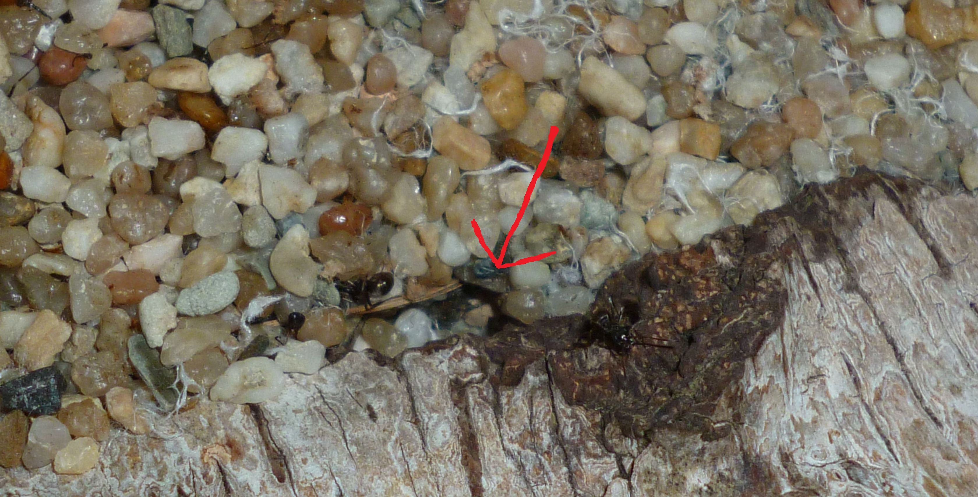 Das Holznest wurde zuletzt bereits in geringem Maße genutzt, während die Ameisen es zu Beginn regelrecht gemieden haben. Die Idee hinter dem Holznest, und der Anordnung zwischen Becken und Ytongnest, soll ja die Situation in der Natur ein Stück weit nachstellen. Dort findet man