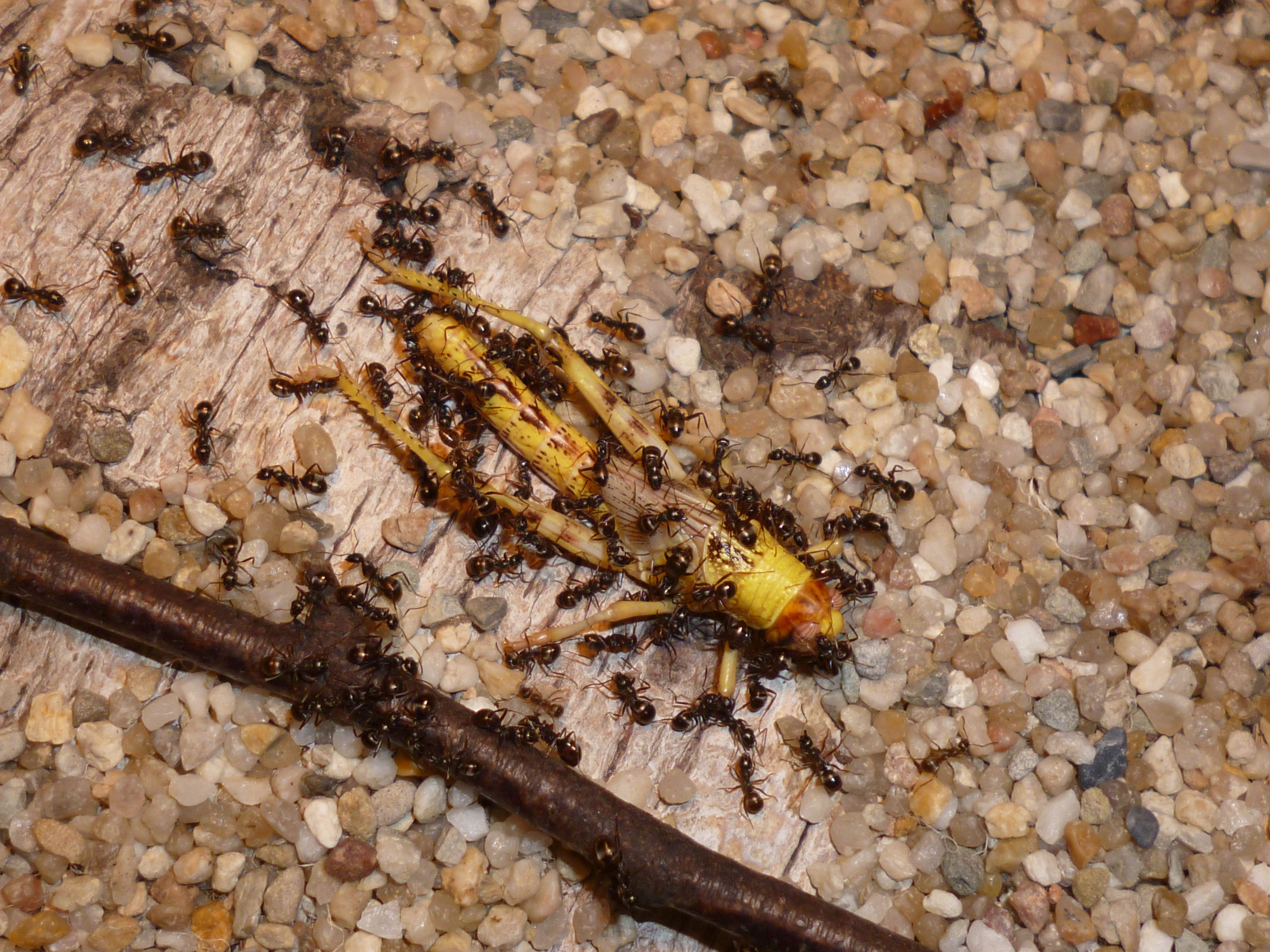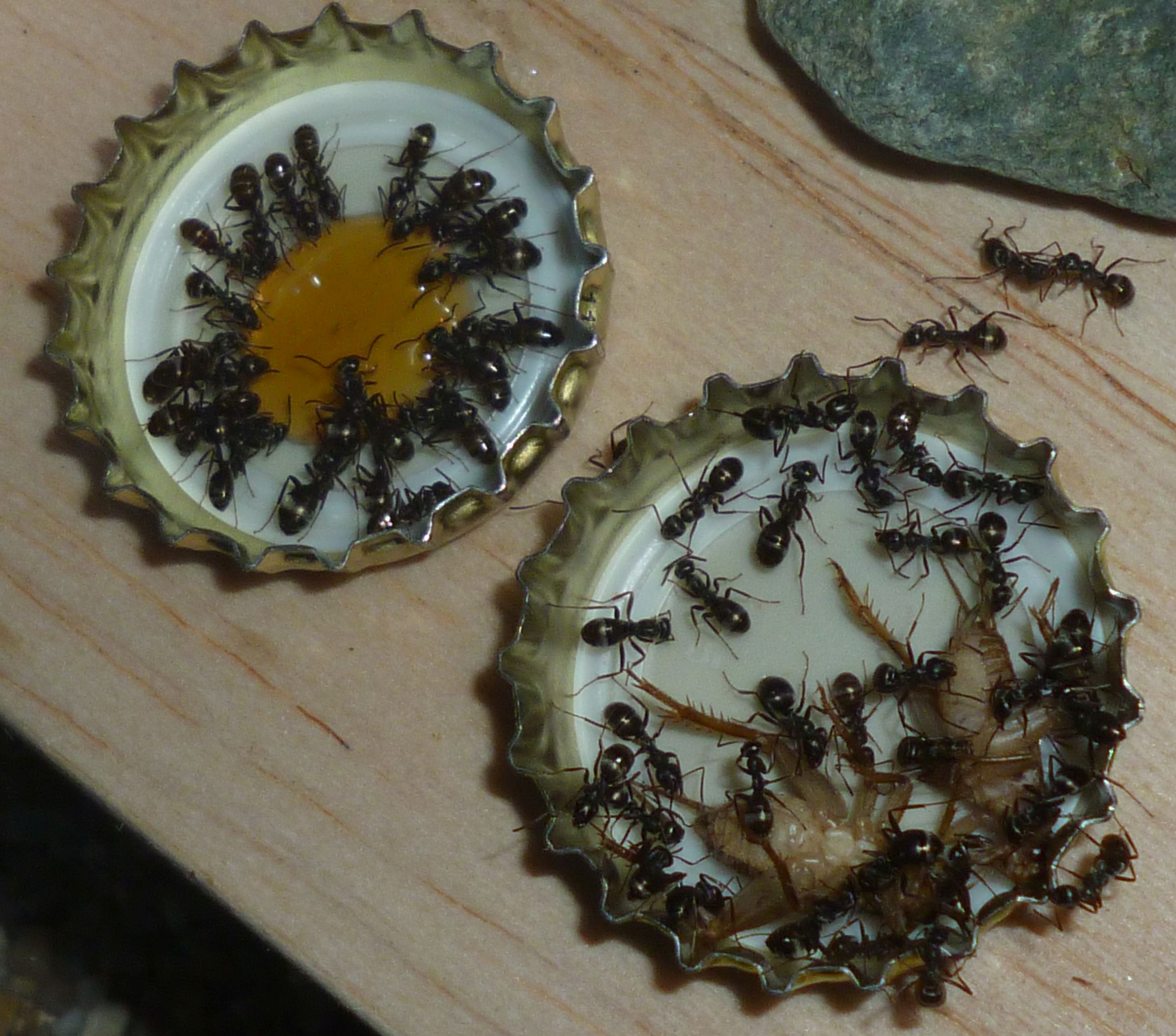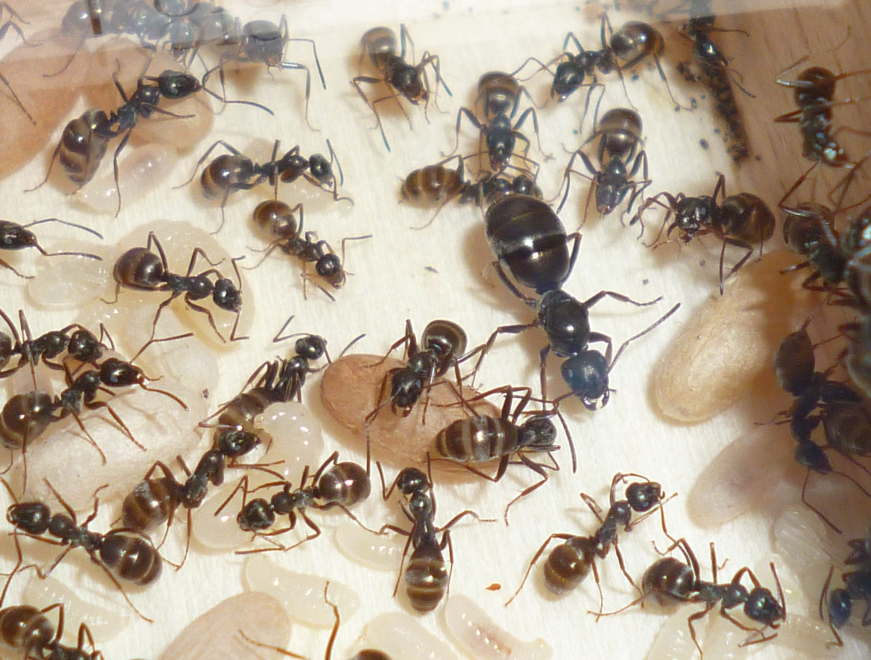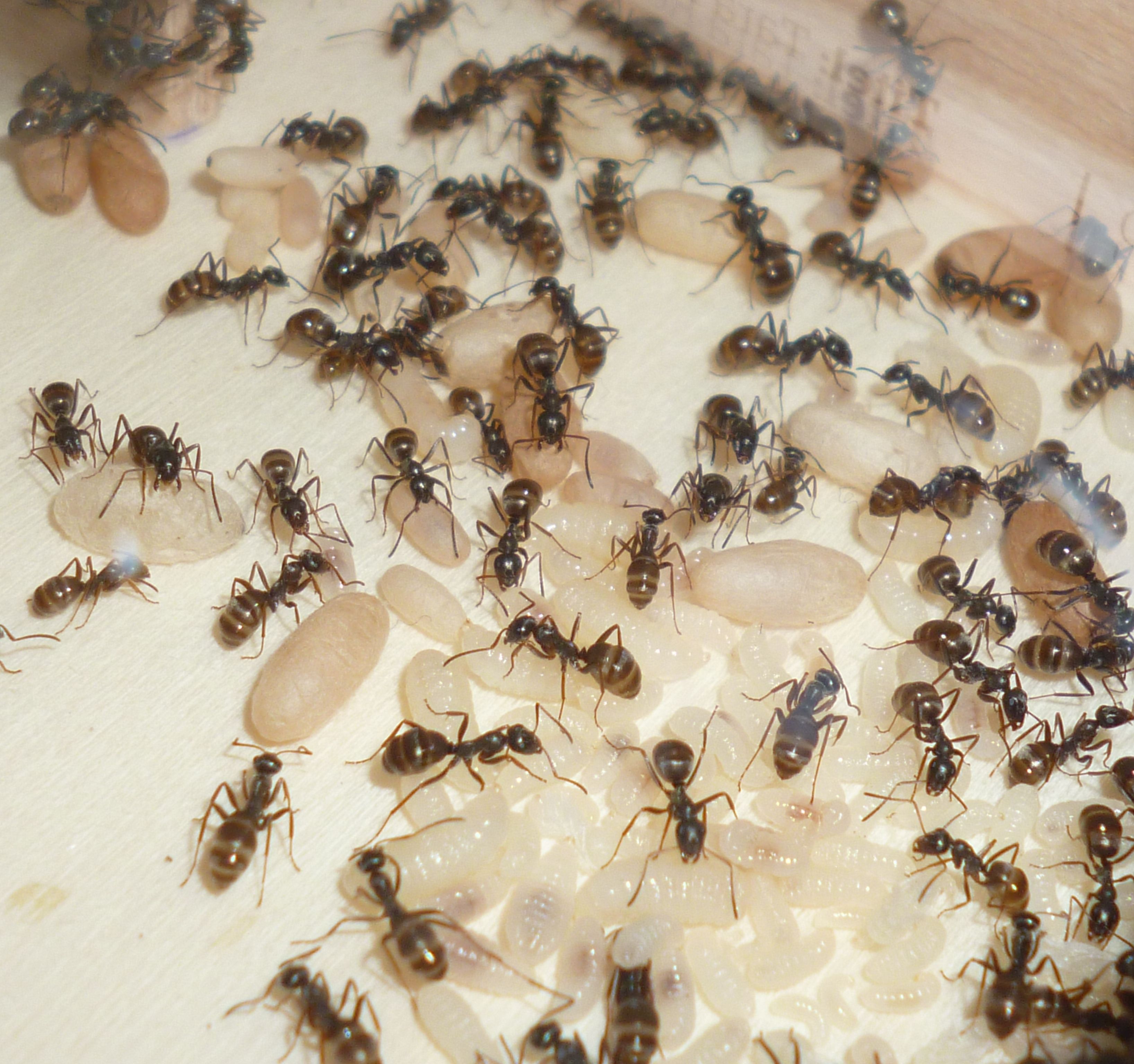 Das Holznest wurde zuletzt bereits in geringem Maße genutzt, während die Ameisen es zu Beginn regelrecht gemieden haben. Die Idee hinter dem Holznest, und der Anordnung zwischen Becken und Ytongnest, soll ja die Situation in der Natur ein Stück weit nachstellen. Dort findet man