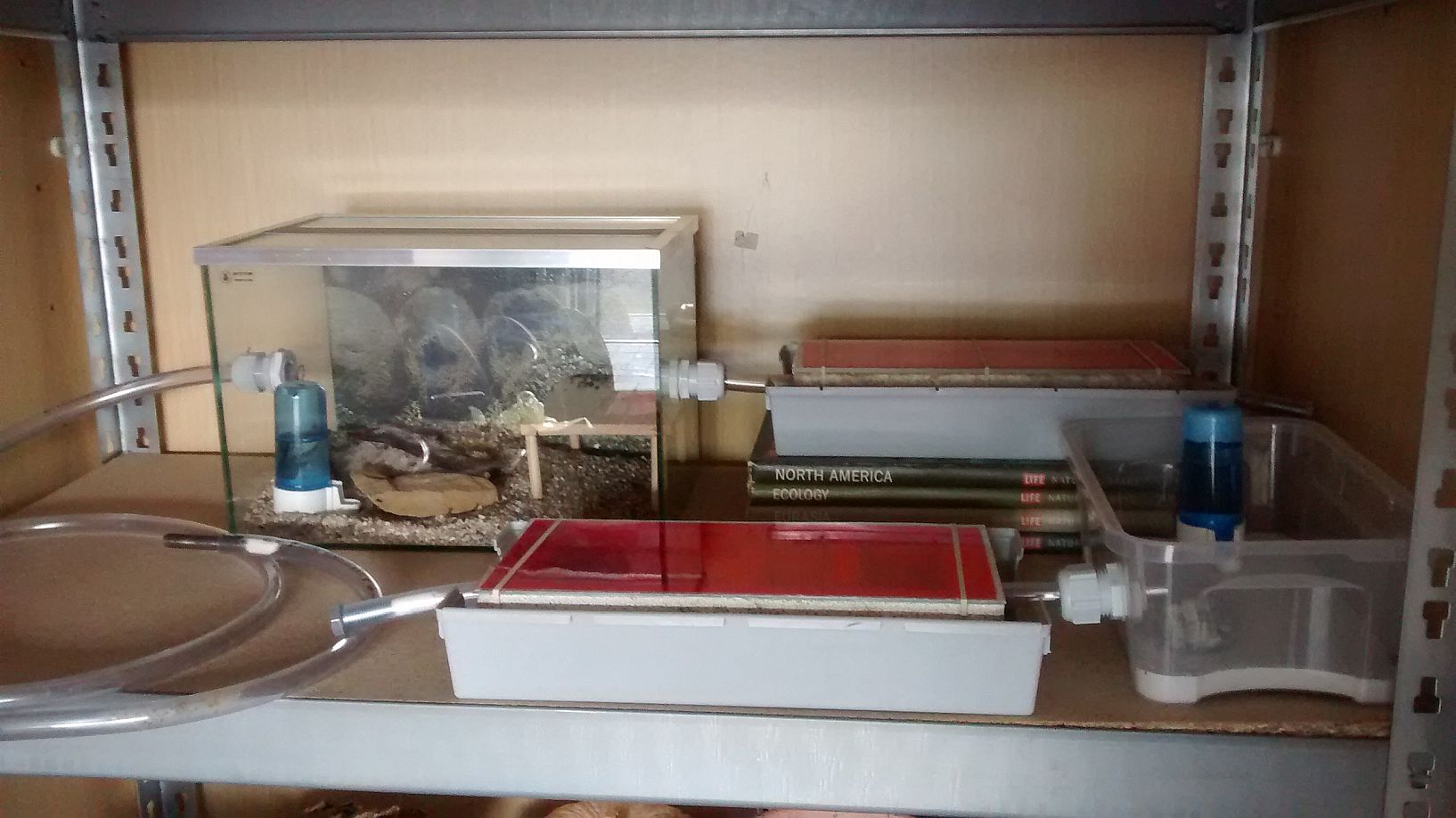Um dem einen Riegel vorzuschieben, habe ich noch einen Glasrahmen angebracht, welcher von unten reichlich mit Paraffinöl eingestrichen ist. Auch den Ölstreifen am Beckenrand selbst habe ich erneuert. Anders als auf dem Bild liegt normalerweise der Deckel noch zusätzlich auf dem Rahmen.