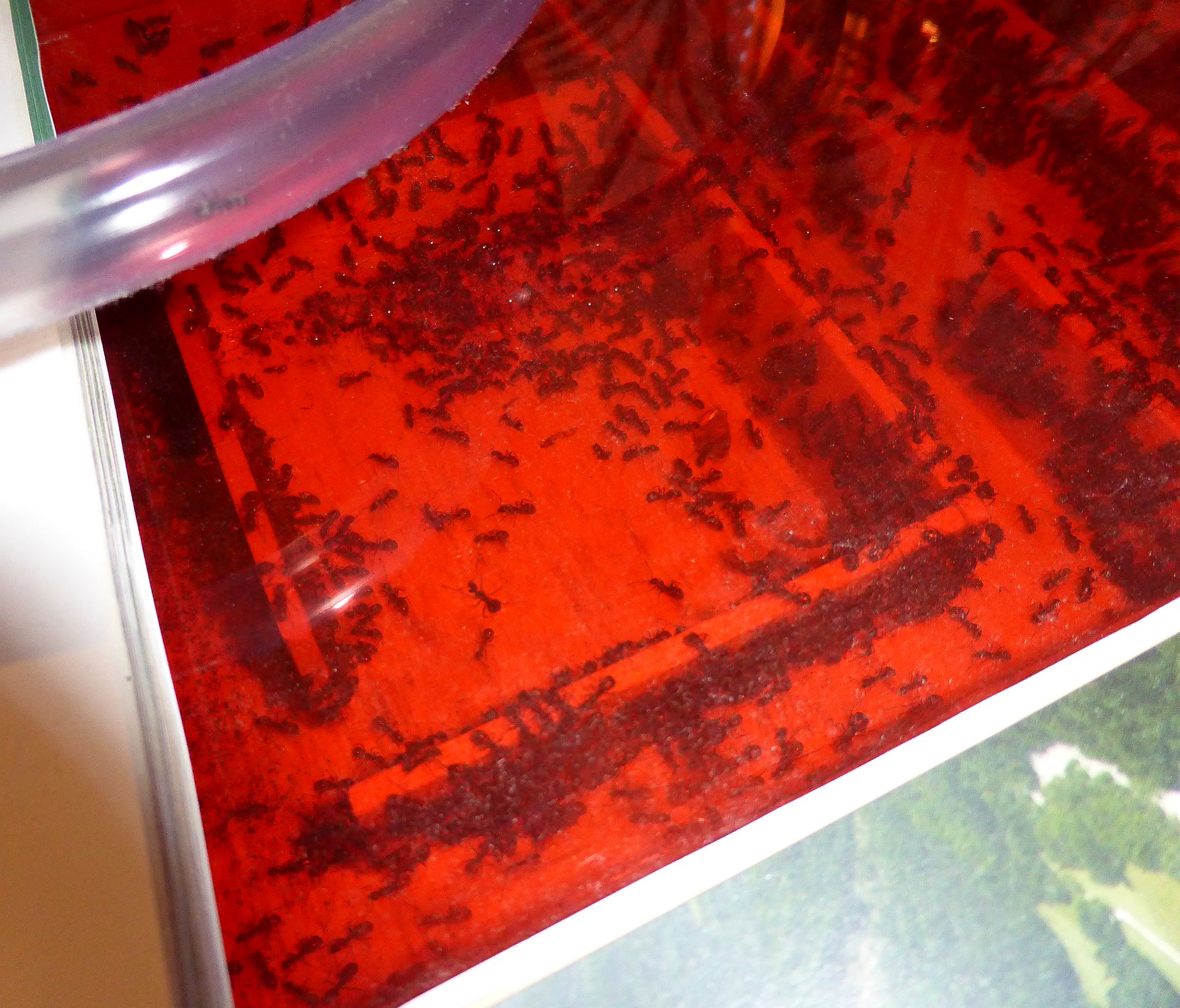 Ich habe ein paar aktuelle Infos zu der Kolonie. Am Wochenende hatten mein Kollege und ich uns zum Grillen getroffen, und bei der Gelegenheit Fotos sowie ein Video von den Ameisen ausgetauscht. Die Kolonie gedeiht bestens in seiner Obhut :)