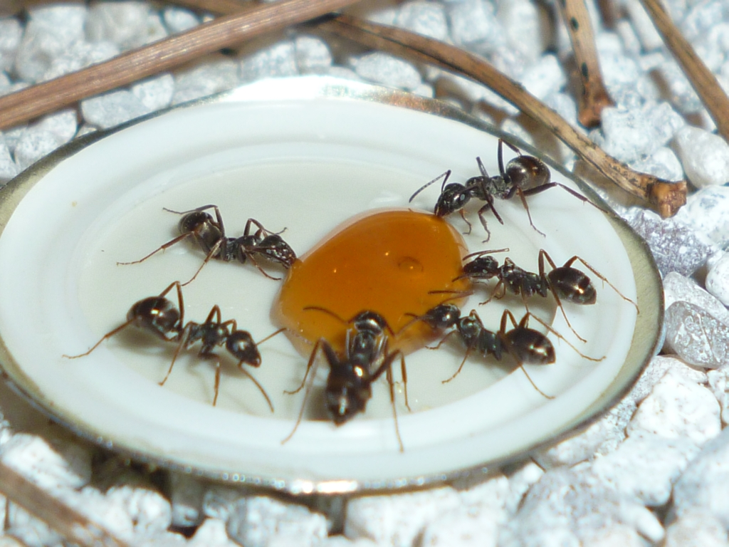 Ich hatte ein PlĂ€ttchen mit Honigtropfen bereitgestellt. Das wurde schnell geleert und ich habe fĂŒr Nachschub gesorgt.