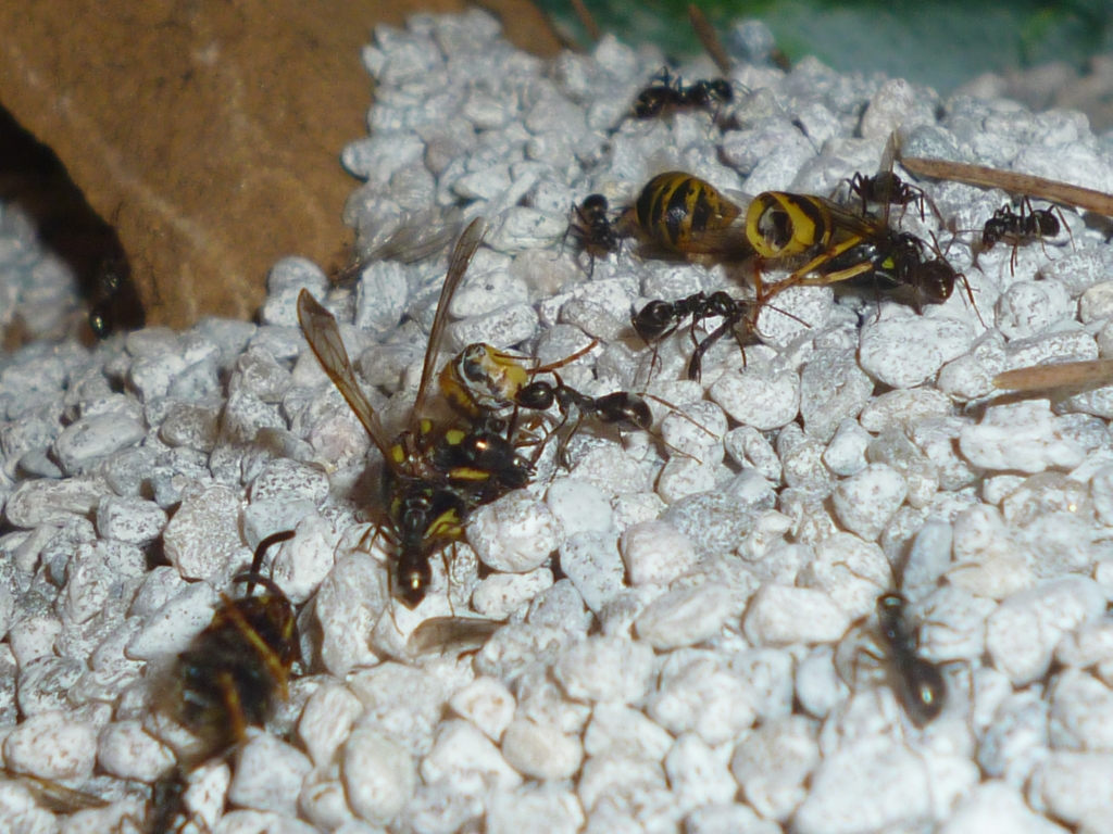 Heute gab es als besonderen Festschmaus eine Portion zerschnittener Wespen. Auf den Bildern lassen sich die GrĂ¶ĂŸenunterschiede zwischen den Arbeiterinnen gut erkennen. Nach etwa einer Viertelstunde war der Zauber schon wieder vorbei, und die Ameisen hockten mit der Beute im verschlossenen Nest.