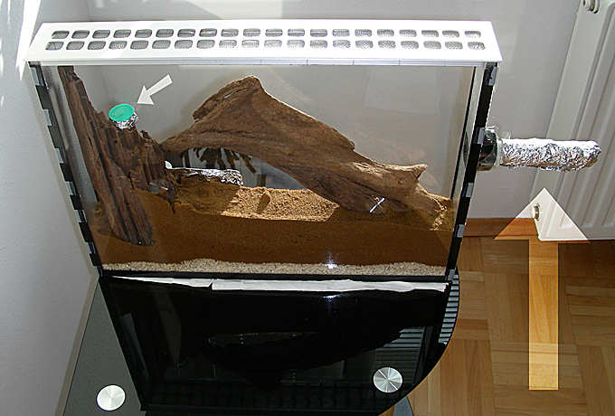3. Formikarium auf seinen Platz. Kl. Pfeil zeigt auf kleine Plattform mit Honigwassertropfen, gr. Pfeil auf die Brutspritze mit