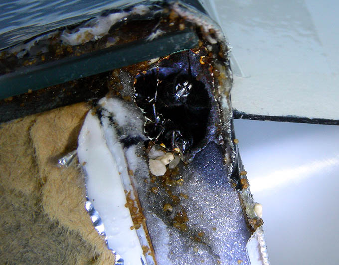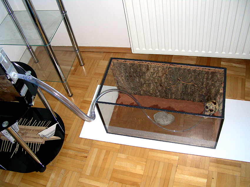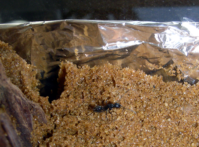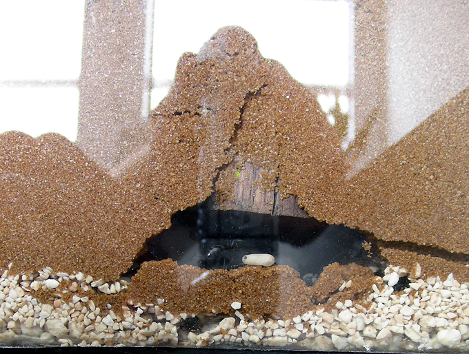 07.06.2009 Hab entdeckt das sie ein kleines Loch an der untersten Seite nach Hinten hinaus gebohrt haben und dort Steinchen und Sand nach unten fallen ließen auf den Boden. Sammelte 2 Arbeiterinnen ein die draußen deswegen herum liefen und verschloß das Loch mit einem Textilklebeband.