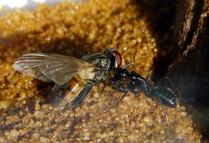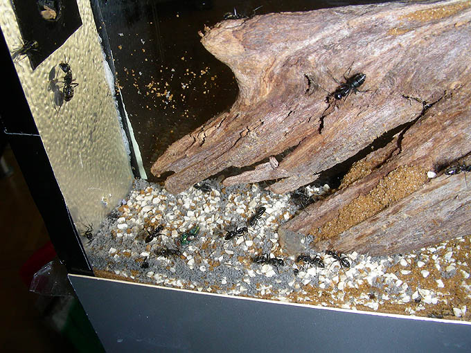 28.08.2008 Hab heute draußen, ausserhalb vom Formikarium eine kleine flinke Camponotus laufen gesehen. Die tote Gelse von gestern haben sie genommen - sowie auch etwas Honigwasser - sind meistens eher Nachtaktiv zur Zeit (wohl sicherer für sie). Kleine Kugelspinnen mögen sie nicht - gab ihnen heute eine tote Essigfliege sowie wieder Honigwasser in die Futterspritze.