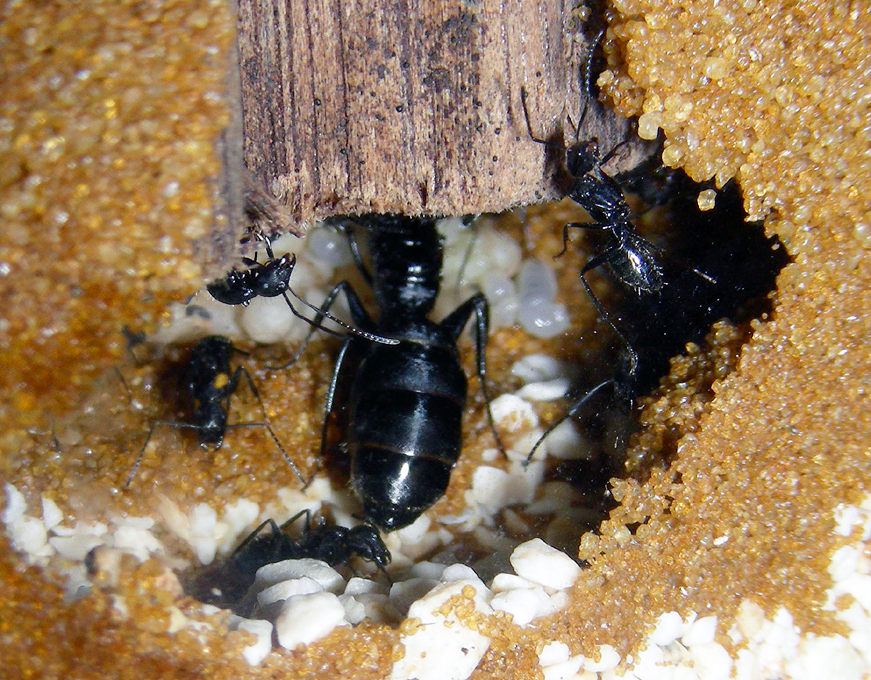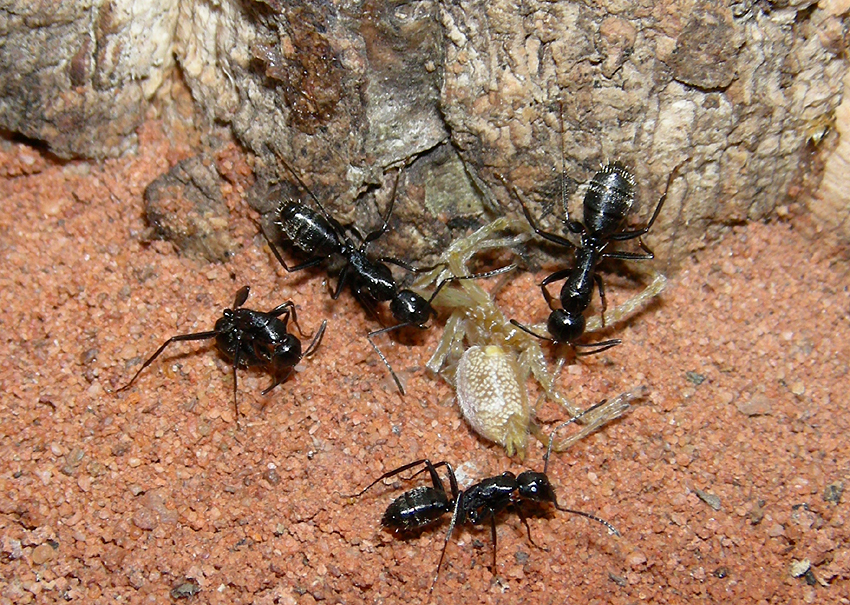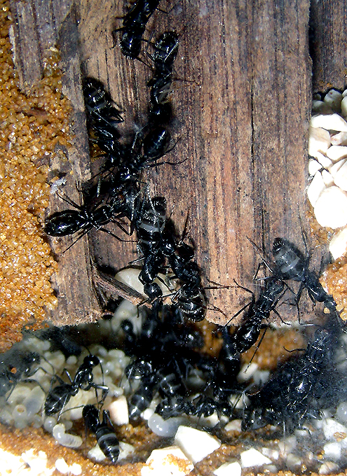 22.04.2009 Alles läuft bestens - hab auch schon eine minor-Arbeiterin gesehen unter den minima-Arbeiterinnen die aber nur kurz mal zu sehen war - nachdem ich nachfeuchtete. Auch seit 3 Wochen ca. geb ich ihnen ein neues Honigwasser/Vitamin-Eiweissgemisch welches bis jetzt sehr gut angenommen wird und so auch natürlich gute Inhaltsstoffe enthält. Erhoffe mir dadurch ein schnellere Entwicklung zu größeren Arbeitern - auch Supradyn-Multivitamin-mix ich von Zeit zu Zeit ebenfalls hinzu. Auf der Insektenliste stehen sie bei mir ganz oben und ich versuch ihnen immer frische Insekten in die Brutkammer zu geben. Hauptsächlich mögen sie am liebsten alle Arten von Fliegen oder Spinnen. Bei der Zitterspinne bin ich mir aber noch nicht so sicher ob sie die wegbekommen! Kleine Heimchen nehmen sie auch - aber ich glaub die haben die Camponotus nicht so gern wie zB. die Formica cunicularia die wirklich alles gerne nehmen - egal wie alt!