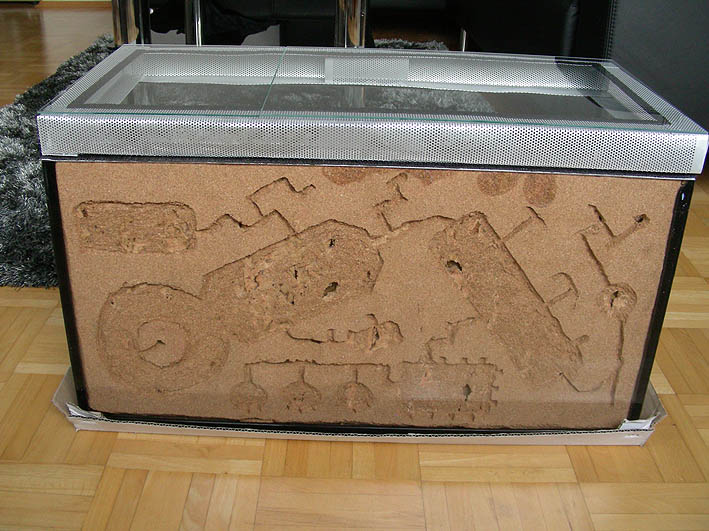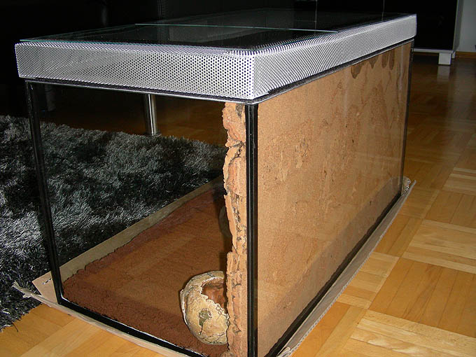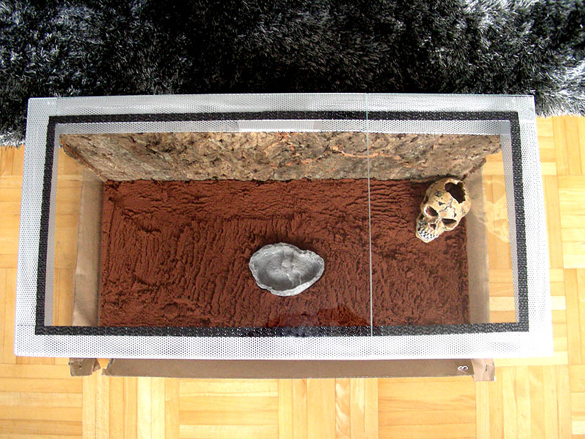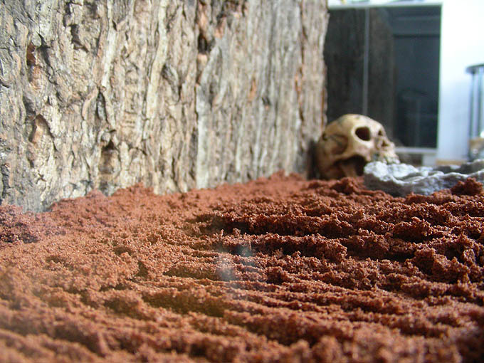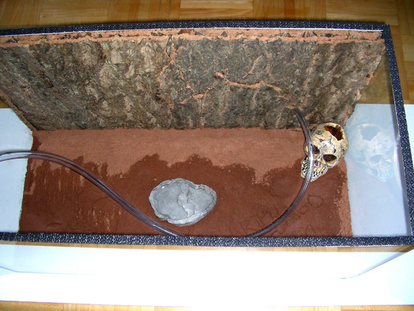 Der Sand umfasst ein Magrovenholz welches ich mit einigen Löchern versehen habe. Das Magrovenholz ist weniger Schimmelanfällig - ist aber jedoch ziemlich hart und es ist noch fraglich ob die C. vagus das überhaupt bearbeiten können.