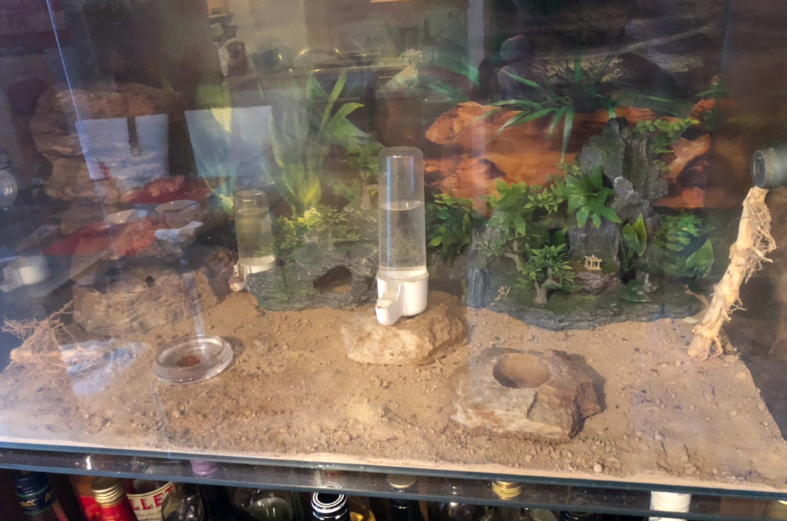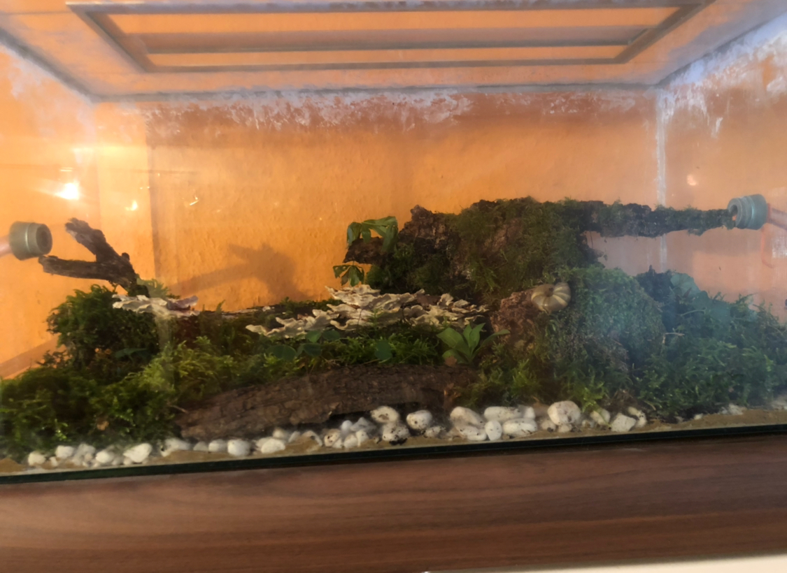 Wald: morsches Holz und Moos inkl aller Kleintiere die von Natur aus enthalten sind. Alle 2-3 Tage, ein paar Spritzer Wasser.
