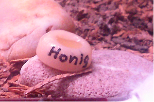 Hier seht ihr ein altes Aquarium mit etwas Waldboden, einem sehr schönen (von Dreamwolf gebauten) Holznest, ein selbst gebastelter "Honigtopf", ein paar Steine und ein Gummitier als Deko. Unglaublich viel verändert hat sich optisch durch den Hintergrund: Ein vergrößertes Urlaubsbild aus Bayern (Danke Oma).
