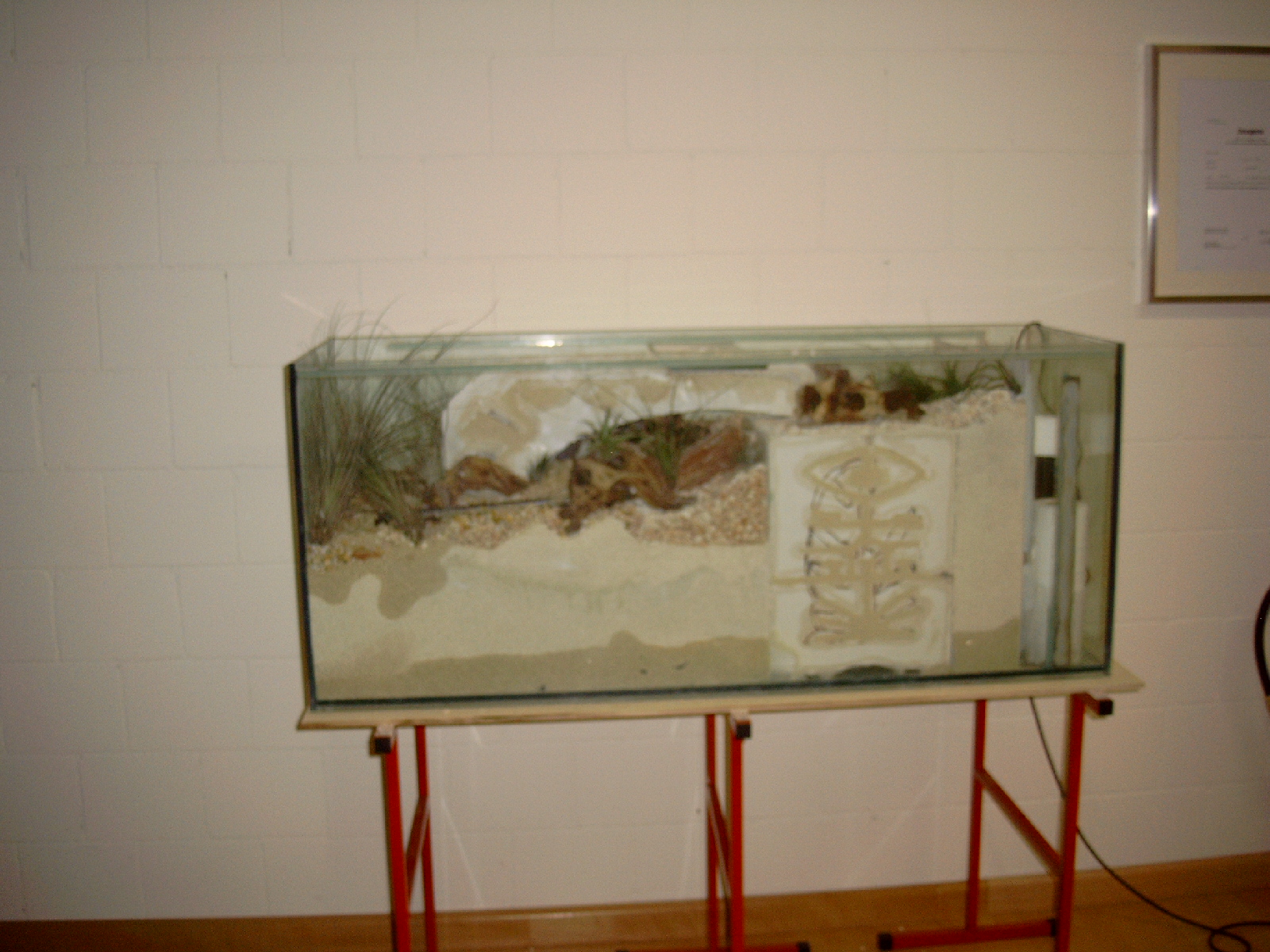 Da das ja nicht grad schön anzuschauen ist, hab ich den ganzen Spass mit Stoff verkleidet mit Sprühkleber versehen und mit Sand bestreut. Die Arena wird somit 100%ig umgrabdicht. Ist ne Heidenarbeit und klebt wie Hölle aber wird doch noch recht ansehnlich wenn man etwas Fantasie hat.