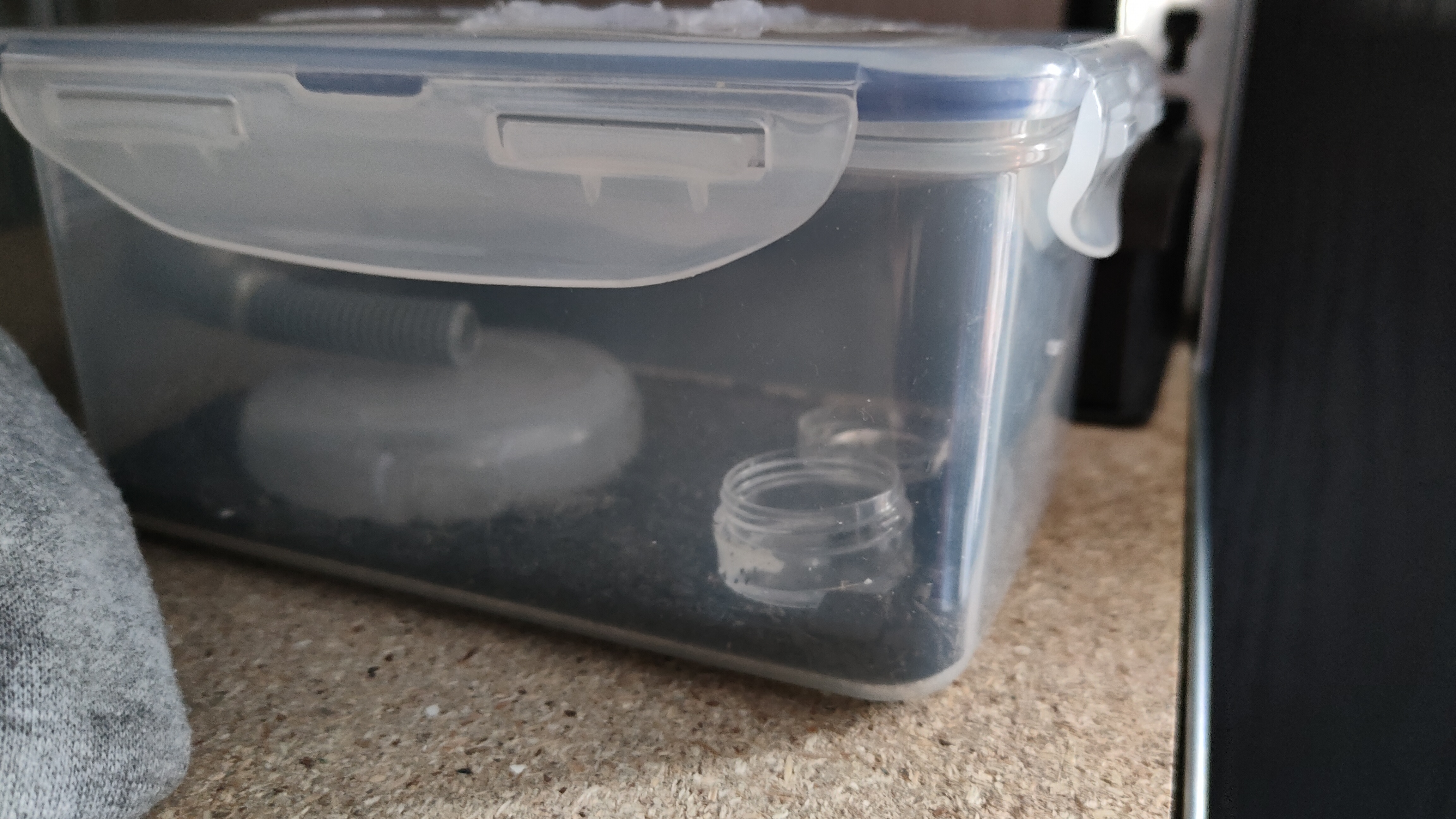 Süßes Döschen, sogar mit M25 Anschluss. :D Wieso machst Du oben die Klipse zu? Damit gibt es ständig Erschütterungen, wenn Du diese öffnest und schließt. Da die Dose eine Gummidichtung hat, sollte der Deckel damit locker aufliegen (nicht schief, drauf achten).