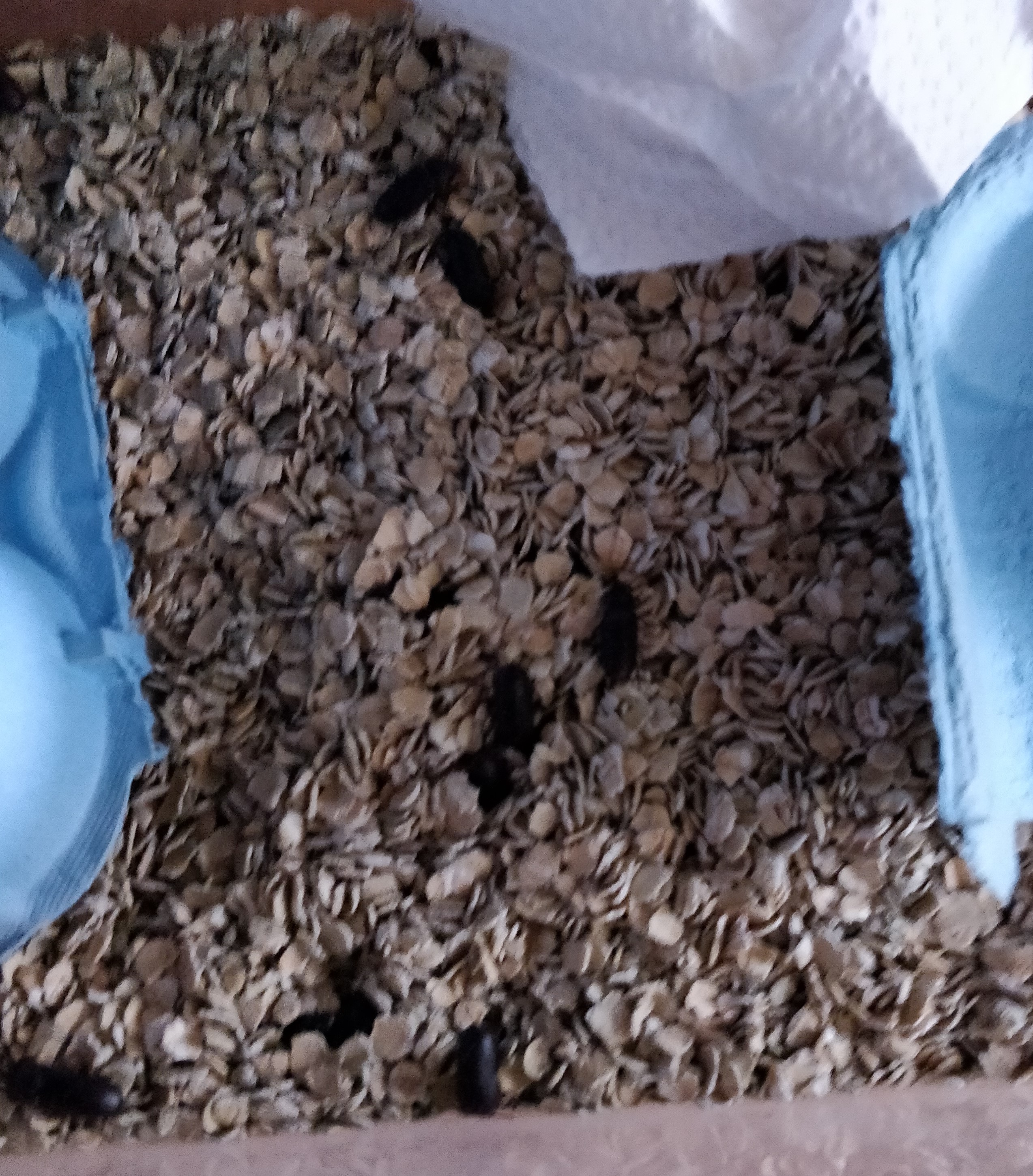 Ich habe vor ca. einem Monat viele Mehlkäfer bekommen und diese in eine Box mit Haferflocken getan. Nun wird das Substrat so langsam etwas schimmelig und ich würde da gerne etwas sauber machen. Allerdings weiss ich nicht genau wie, denn in dem Substat sitzen nun ja sicher viele viele Mehlwurmeier und ggf. sogar kleine Larven? Ich habe noch nicht ganz verstanden wie und wo man im Zyklus die Reinigung einbaut. Auf dem Bild sieht man, dass links die Haferflocken schon etwas schimmeln.
