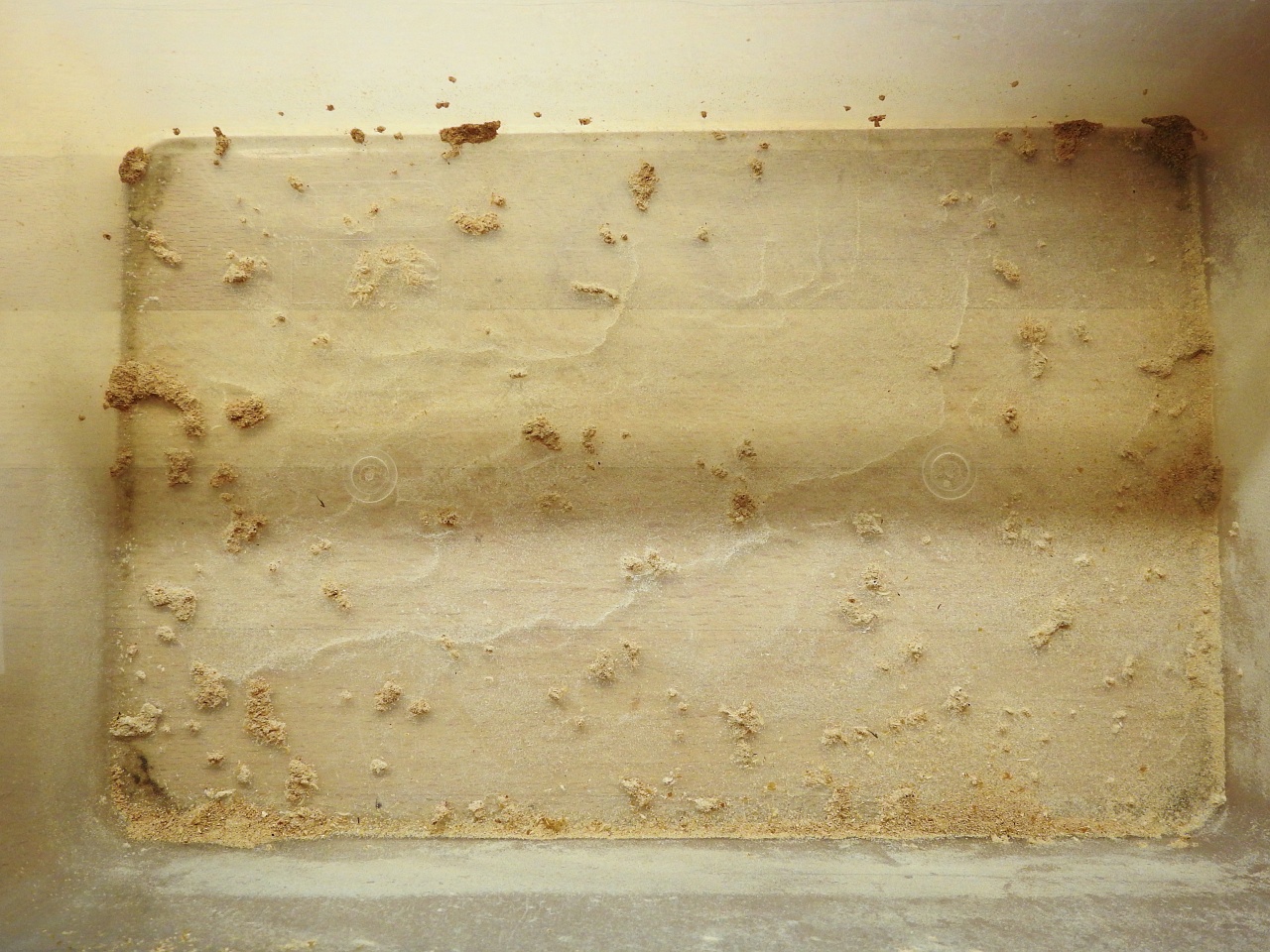 wenn das Substrat schimmelt fütterst du auf jeden Fall zu viel feuchtes Gemüse oder Obst, das brauchst du nur ganz sparsam verfüttern. Die Eier legen die Mehlkäfer am Boden ab und diese kleben dann auch recht gut am Boden. Deshalb kannst du die Käfer jetzt ganz einfach absammeln und das Substrat ausschütten, du solltest dann kleine Flecken am Boden sehen, diese bitte nicht abwischen, denn darin sind die Eier. Das sieht dann etwa so aus.