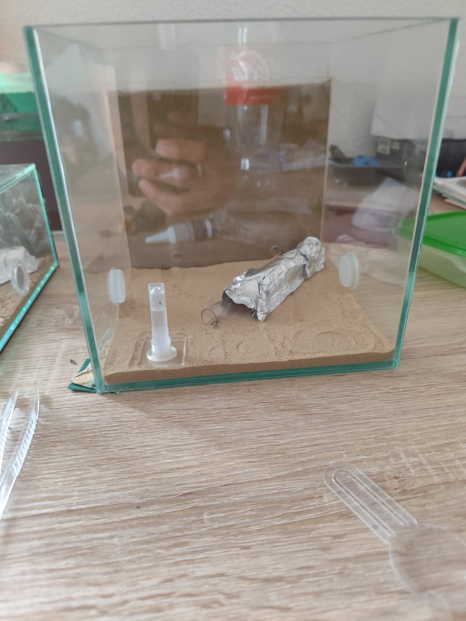 Aktuell ist das Reagenzglas mit seinem Mikroklima praktisch das Nest / Zuhause der Kolonie. Könnte noch etwas dauern, bis die in die Farm-Rückwand einziehen.