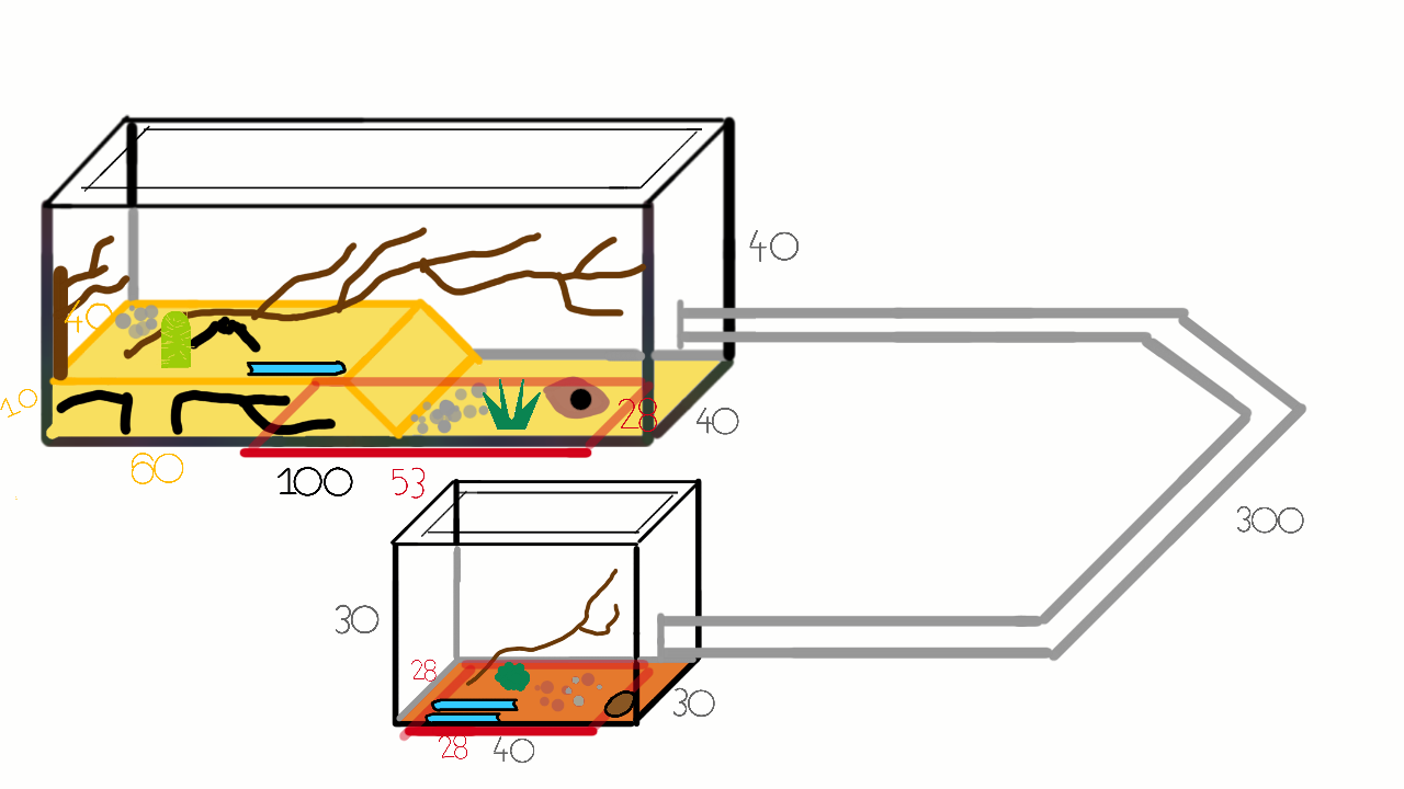 Ich möchte weiterhin ein 100x40x40 Becken mit integriertem Nest, über einen 2-3m Schlauch verbunden mit einem 40x30x30 Becken. Das Ytongnest soll 60x40x10cm groß sein.
