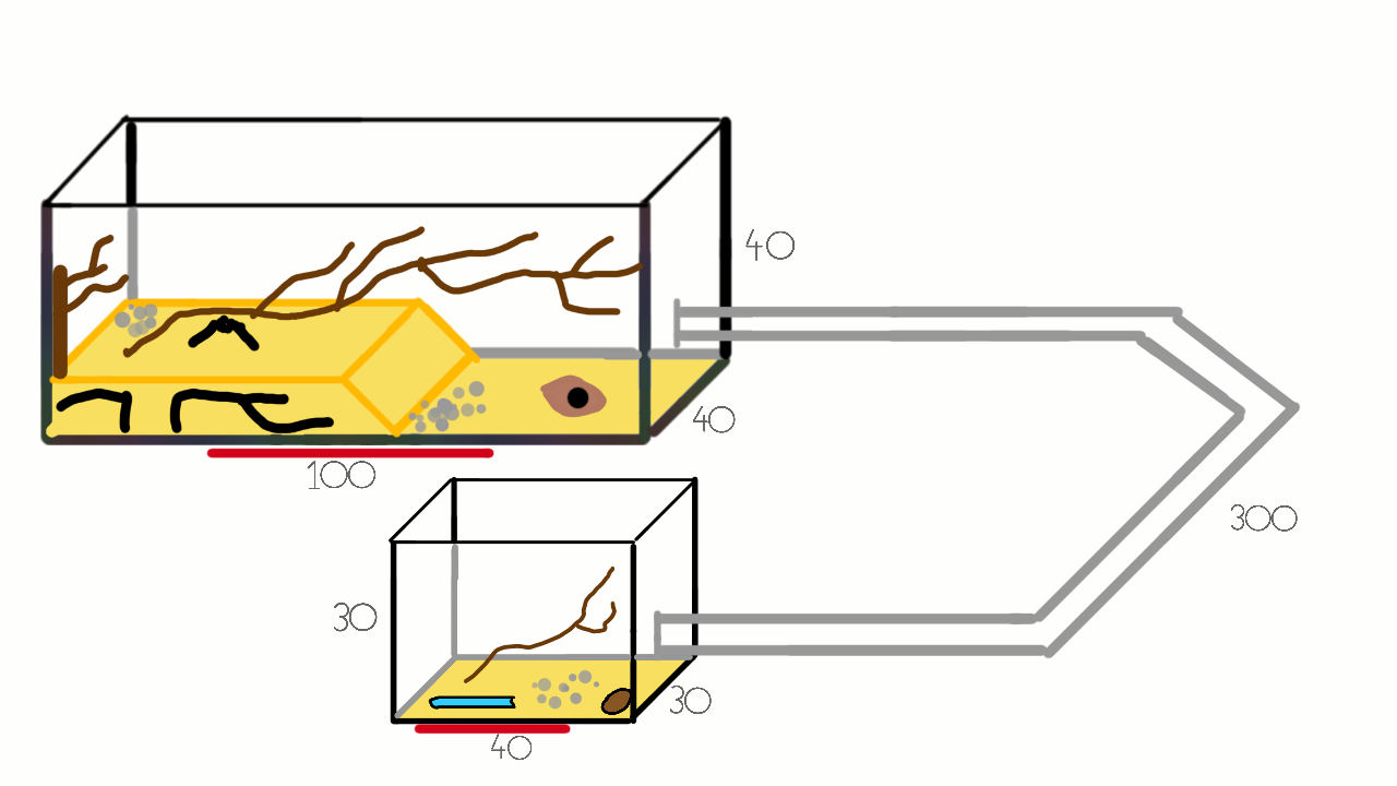 Das Becken soll über einen langen Schlauch (geplant sind 2-3 Meter) mit einem weiteren Becken verbunden sein, um einen schönen Laufweg für die Ameisen zu gestalten. Das zweite Becken soll entweder ein 40x30x30 oder ein 60x30x30 Becken sein und so wie das erste aufgebaut sein, nur ohne integriertem Nest.