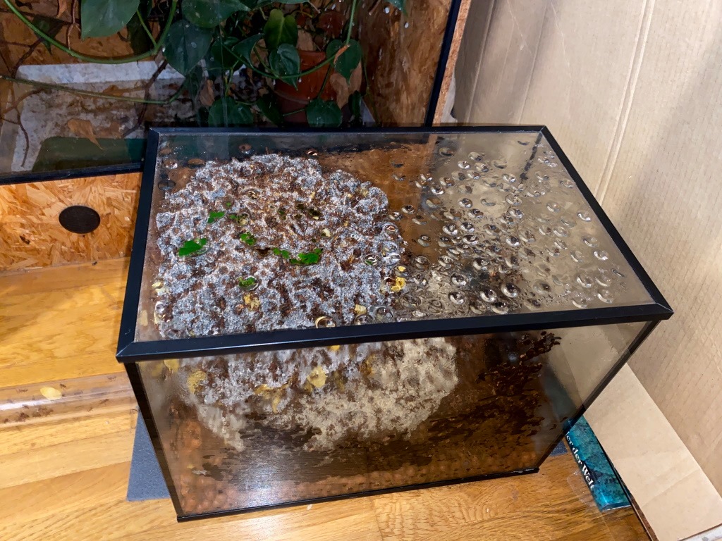 Meine Acromyrmex echinatior Kolonie hatte nach 2 Jahren gut 15 Liter Pilz, verteilt auf 2 Becken: Ein Glasbecken mit 30 Liter Inhalt, welches gut zur HĂ€lfte mit Pilz gefĂŒllt ist (siehe Bild) und eine kleine Plastikbox mit laut HĂ€ndlerangabe 4,4 Liter Volumen, welche auch gut halb voll ist.