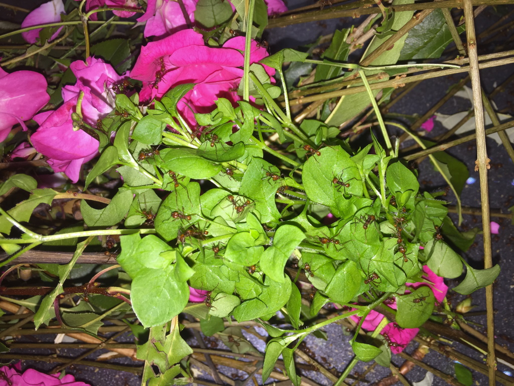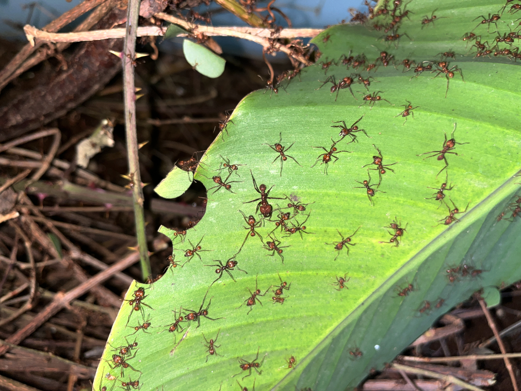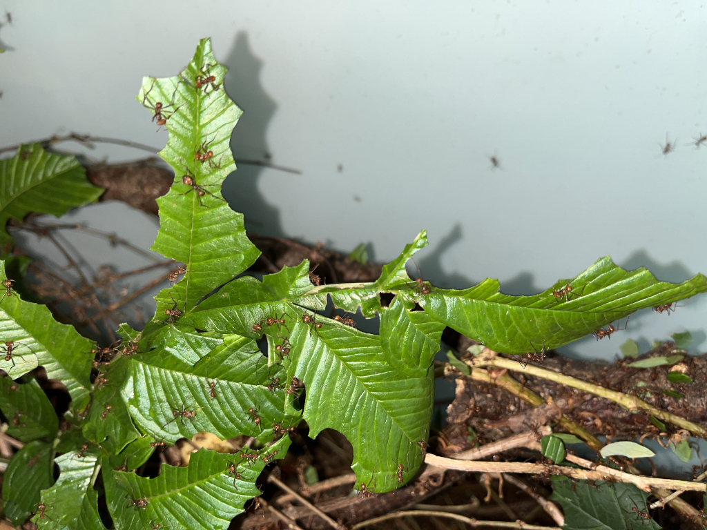 Hier sollte erwĂ€hnt werden, dass gerade kleine Kolonien am Anfang noch recht wĂ€hlerisch sind bzw. sein können. Und unterschiedliche Kolonien unterschiedliche âGeschmĂ€ckerâ haben können â das was die eine Kolonie gerne und willig schneidet, wird von der anderen ignoriert. Meine Atta cephalotes Kolonie hat z.B. lange Zeit RosenblĂŒtenblĂ€tter so gut wie komplett verschmĂ€ht, obwohl diese als Lieblingsfutter von Blattschneiderameisen gelten. Ab ca. einem Liter Pilz wird das besser, sprich wenn sie langsam mehr Futter brauchen, nehmen sie auch mehr verschiedene Pflanzen. Was auch logisch ist: Neue Futterpflanzen bergen das Risiko, dass der Pilz sie nicht mag oder vertrĂ€gt. Also erst Mal bei bisher bewĂ€hrtem bleiben, spĂ€ter bei höherem Bedarf probieren sie dann neue Pflanzen. Die Ameisen âentscheidenâ zusammen mit dem Pilz, ob das was sie schneiden vertrĂ€glich fĂŒr ihn ist. Pilz und Ameisen kommunizieren miteinander.