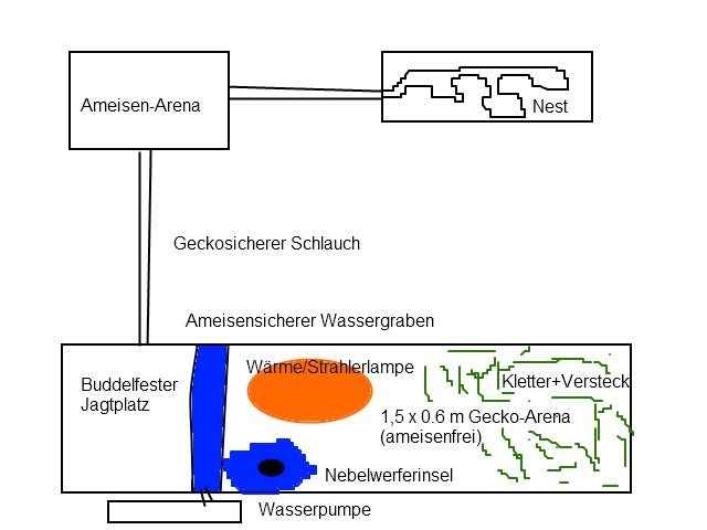Einfach eine geeignete Barriere bauen und das Geckobecken in zwei Bereiche unterteilen. Dass die Ameisen eine RĂŒckzugsmöglichkeit brauchen und sich das Nest natĂŒrlich nicht im Geckobecken befinden darf ist klar.
