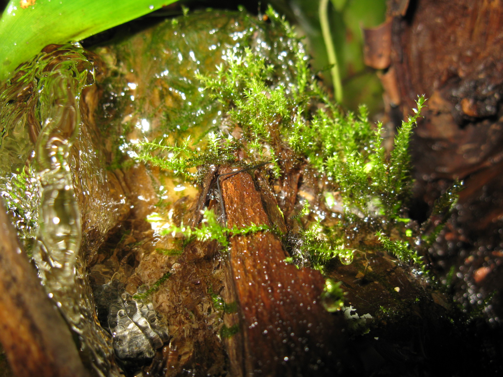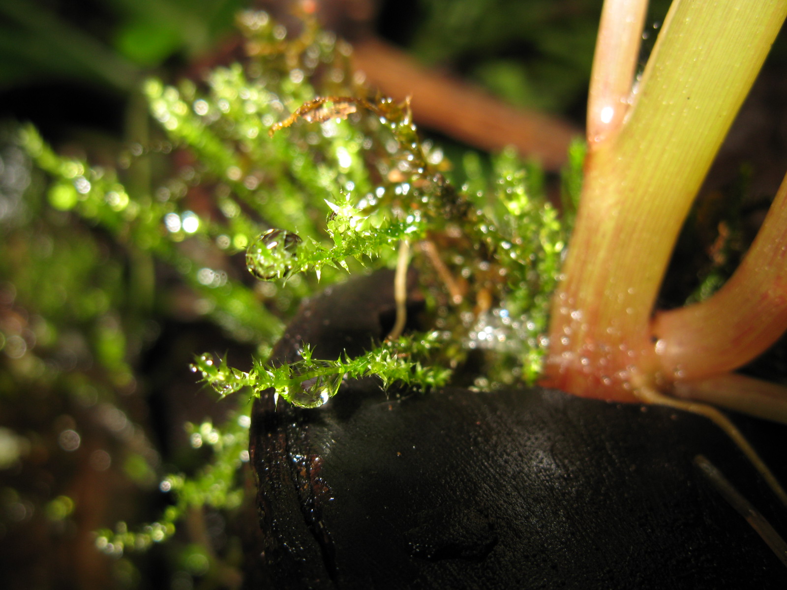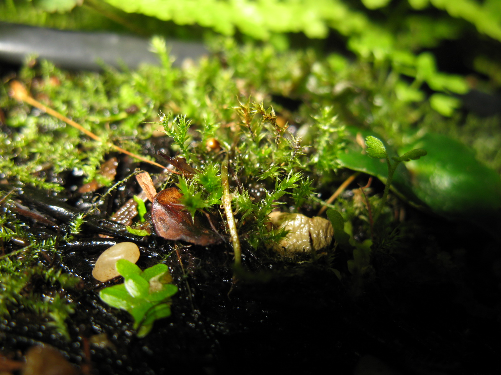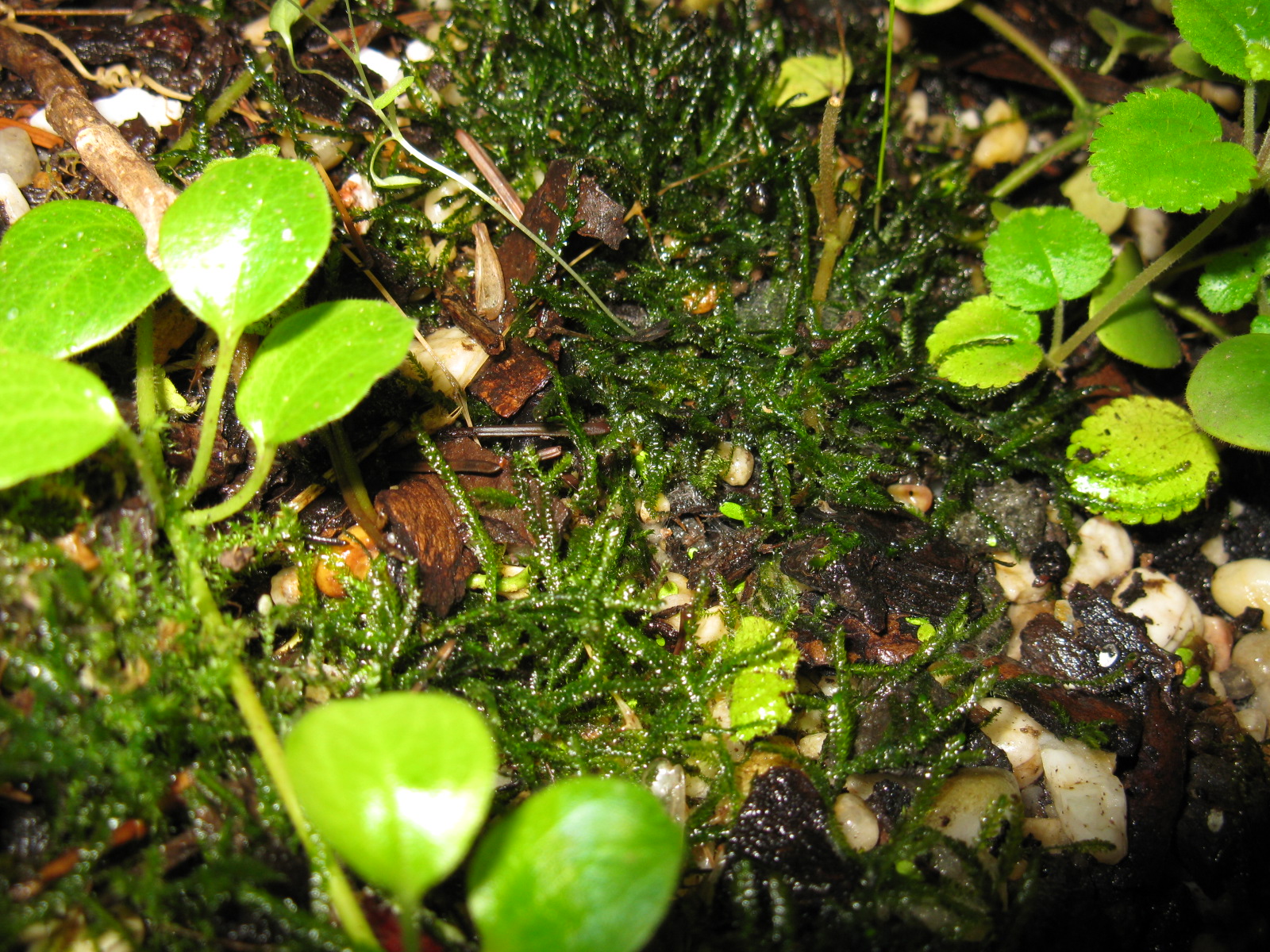 Fotos von verschiedenen Moosen im Terrarium. Die Moose wachsen langsam, aber ĂĽberall und bilden teilweise dichte Rasen.