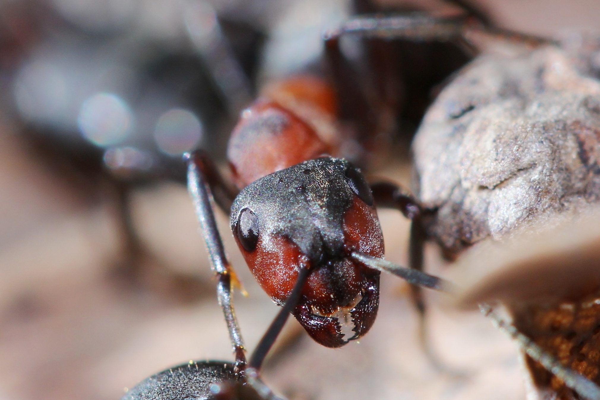7. Nur damit man die Augen heimischer Ameisen, denen ein relativ besseres Sehvermögen attestiert wird, vergleichen kann: Kopf einer Formica cf. rufa.