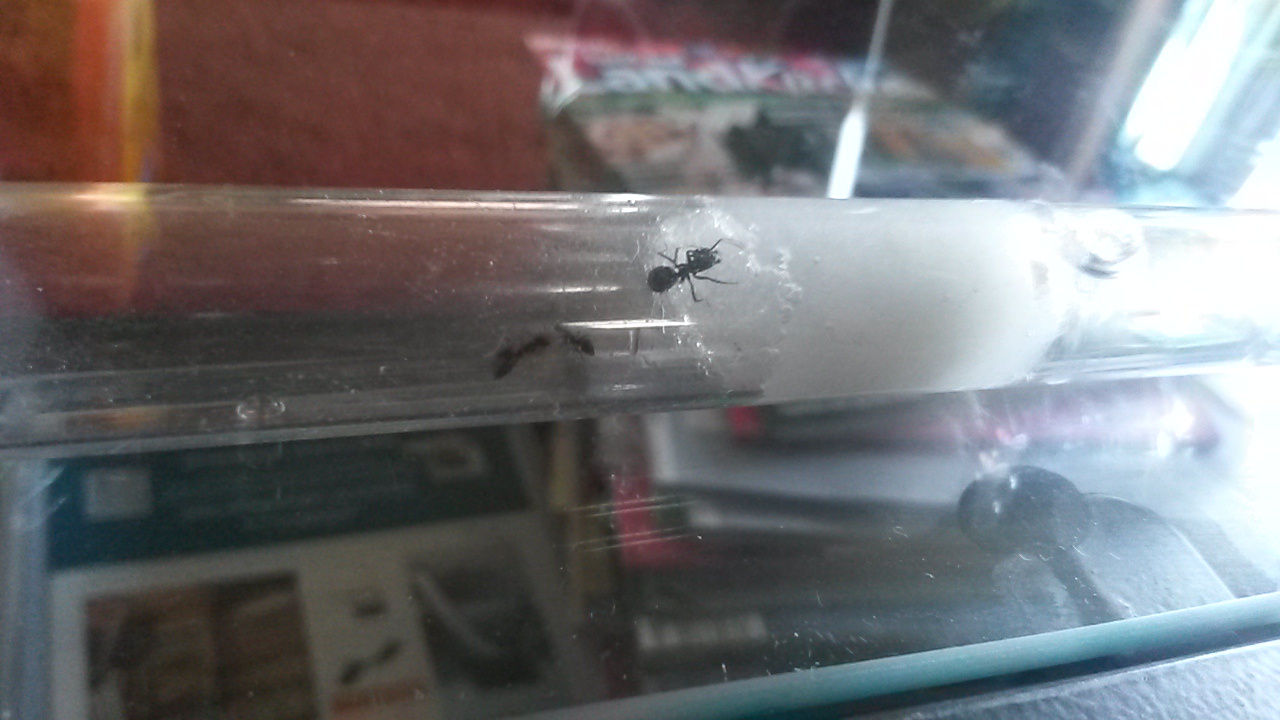 Hier noch mal ein Bild von der "Arbeiterinn". Sie ist 8mm lang. Ich hab versucht sie mit ein paar Lasius sp . Arbeiterinnen zu "vergeselschaften" und TADAAH. Also sie scheinen sich zu vertragen. Sie "chillen nebeneinander im RG. Und es ist keine Formica! Das kann ich garantieren. Kann schon sein das es keine Gyne ist, aber naja. Das Bild ist 3 Stunden alt, jetzt chillen sie.