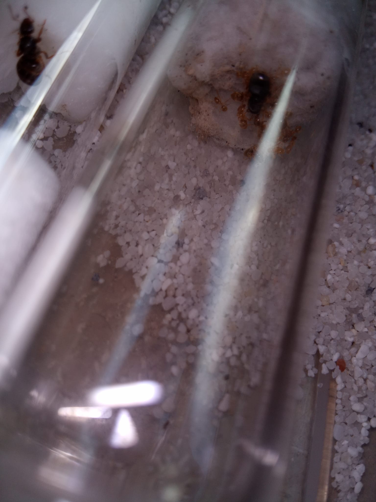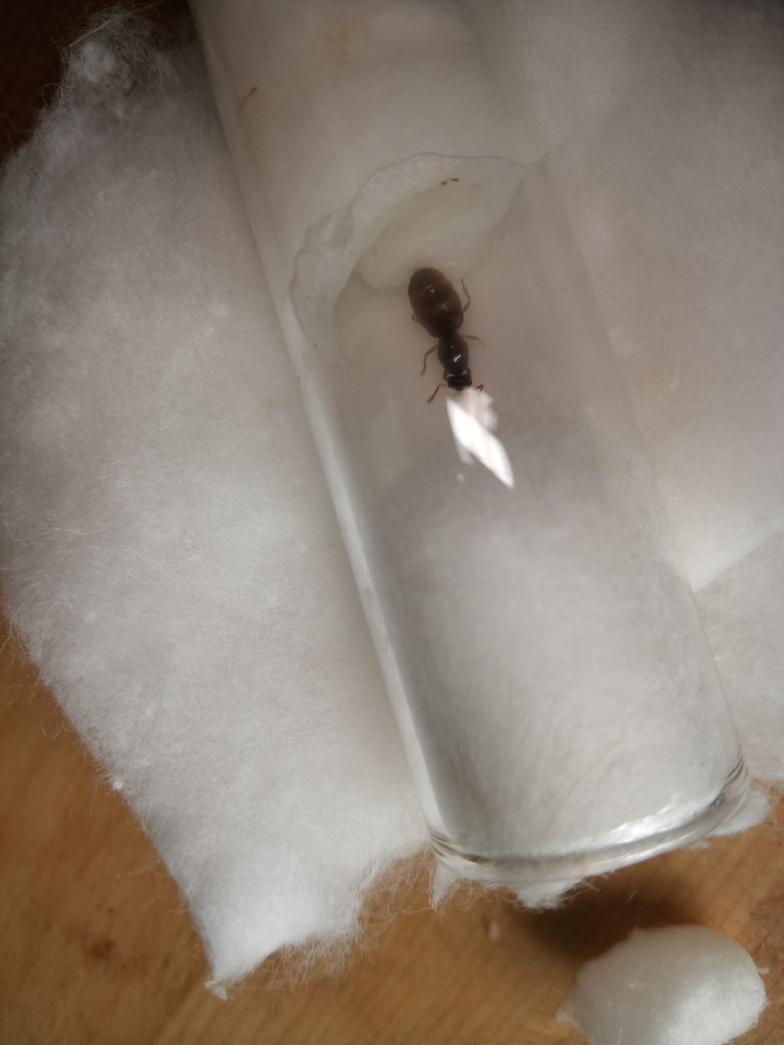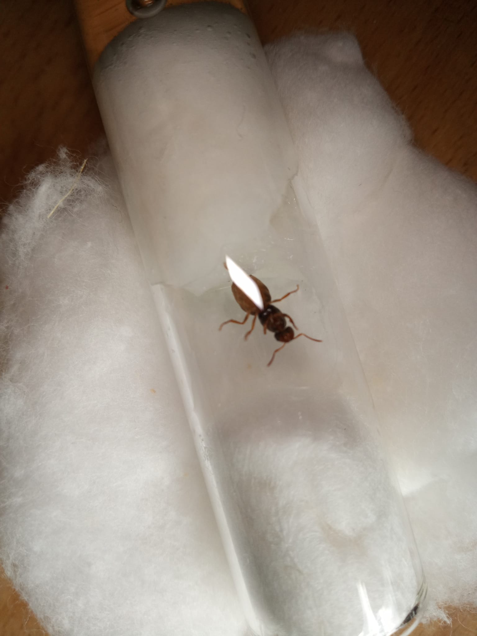 Hey Tara, das ist Cautolasius sp., also flavus oder myops. Ich meine, erkennen zu können, dass die hintere Kopfhälfte durchgehend dunkel ist; tendenziell sollte es sich also eher um flavus handeln. Ein bisschen Größenvariation ist normal; ein knapper cm passt zur Art. Wie viel kleiner ist denn deine flavus-Gyne?