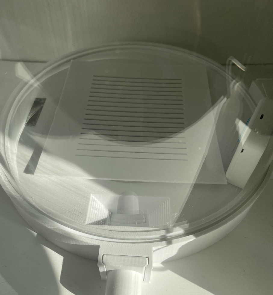 Gedruckt ist das ganze mit ABS aus Deutschland. Das andere Druckmaterial war mir nicht ausreichend genug. Es gibt ein Wassertank den man von außen befüllen kann welcher dann das innere befeuchtet. Es gibt noch eine kleine Plattform mit Schlitzen damit der Pilz nicht in direktem Kontakt zu dem "Plaster" kommt welcher die Feuchtigkeit speichert. Ich habe noch ein kleinen Lüftungsschlitz im Boden welches mit einem Edelstahldraht verschlossen / "verklebt" wurde. Der Deckel besteht aus zwei Teilen.