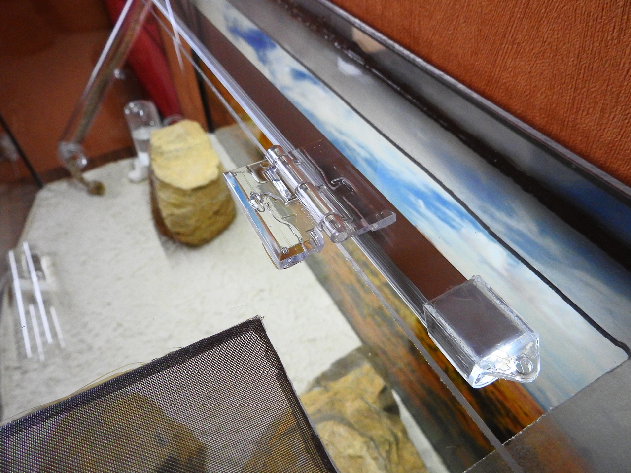 So sieht das Ganze im geöffneten Zustand aus. Die schmalere Scheibe hinten ist 9cm breit, vorne sind es 21cm. Somit habe ich genügend Platz für den (täglichen) Griff in die Arena, ohne den gesamten Deckel abnehmen zu müssen. Die Öffnungen für die Belüftung sind mit Gaze aus Metall verschlossen und haben etwa eine Abmessung von 4,5x11cm.