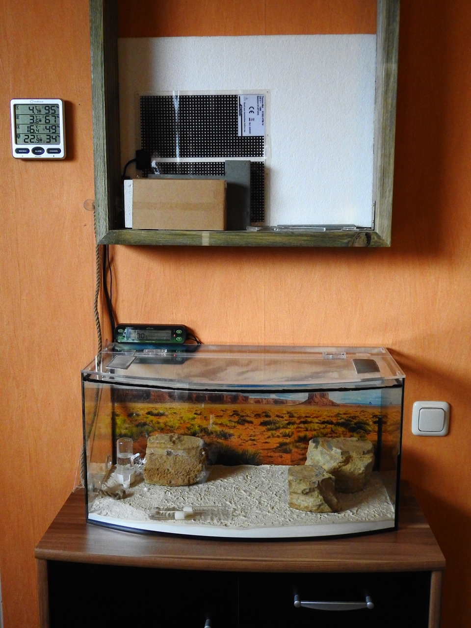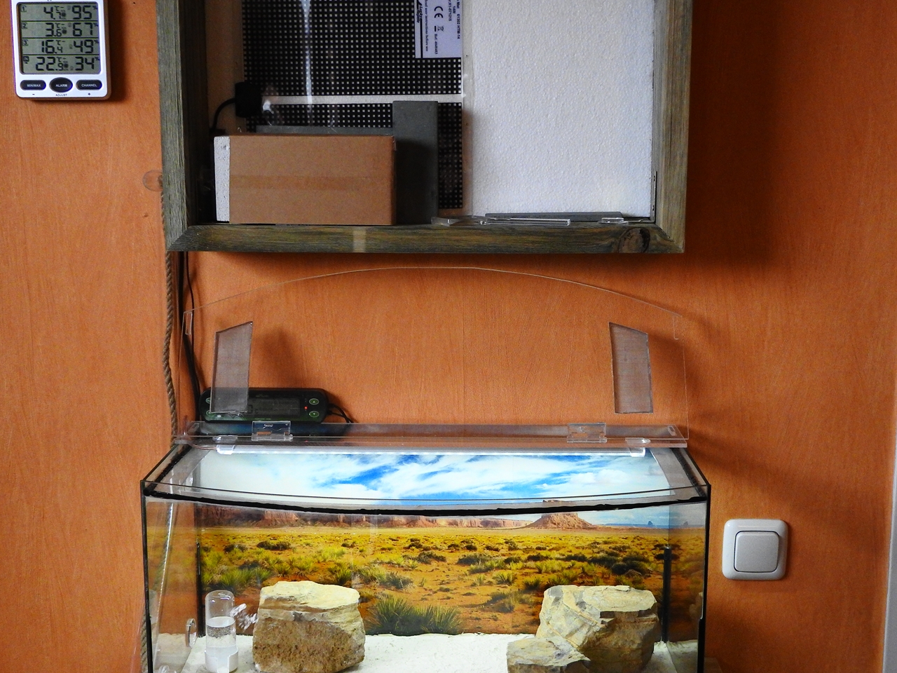 Von innen ist eine 50cm lange LED-Lichtleiste verbaut. Für die Kabelführung habe ich ein Stück aus der Scheibe raus geschnitten und anschließend wieder zu geklebt. Die Lichtleiste ist am Thermostat angeschlossen, so kann ich das Licht wie mit einer Zeitschaltuhr steuern. Als Feature gibt’s dann noch eine Fernbedienung dazu, mit der ich die Lichtleiste dimmen kann.