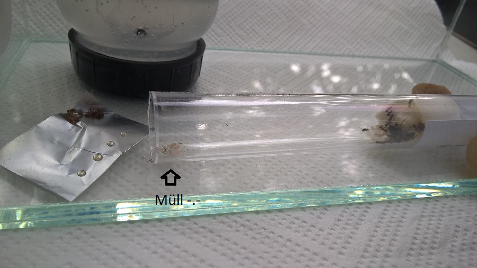 In der "Müllecke" welche sich meine große Kleine am Reagenzglaseingang eingerichtet hat (Stopfen ist noch drauf) liegt sie jedenfalls nicht.