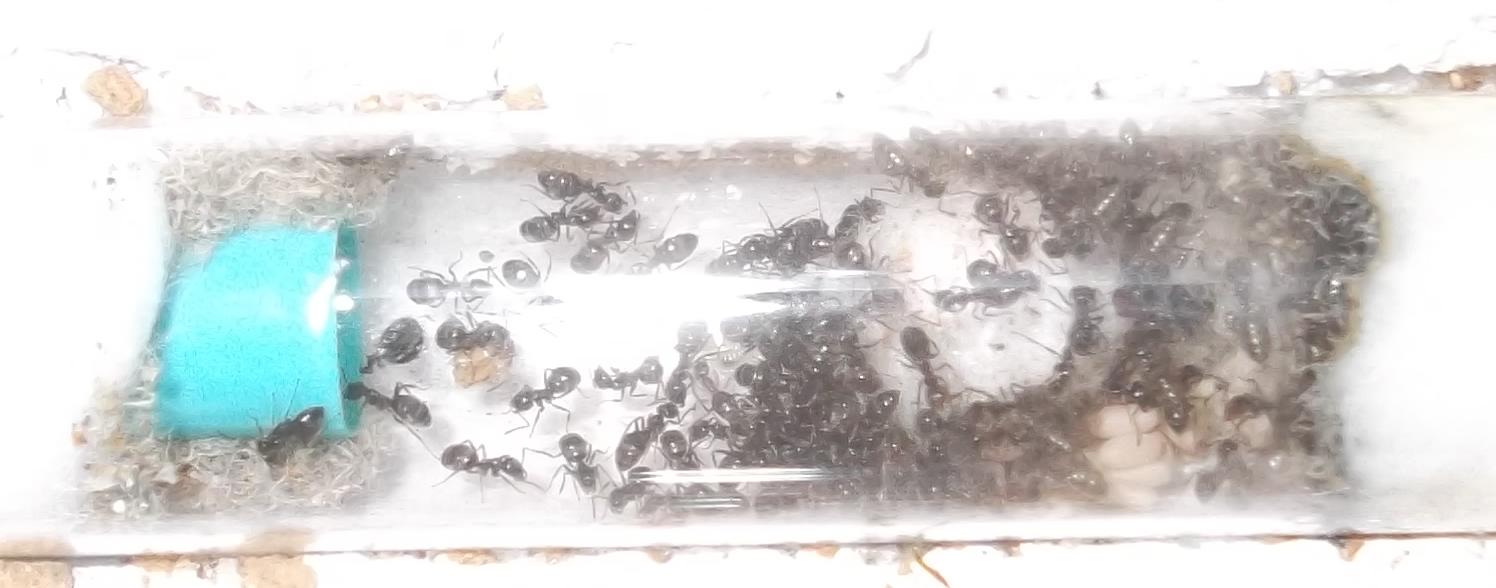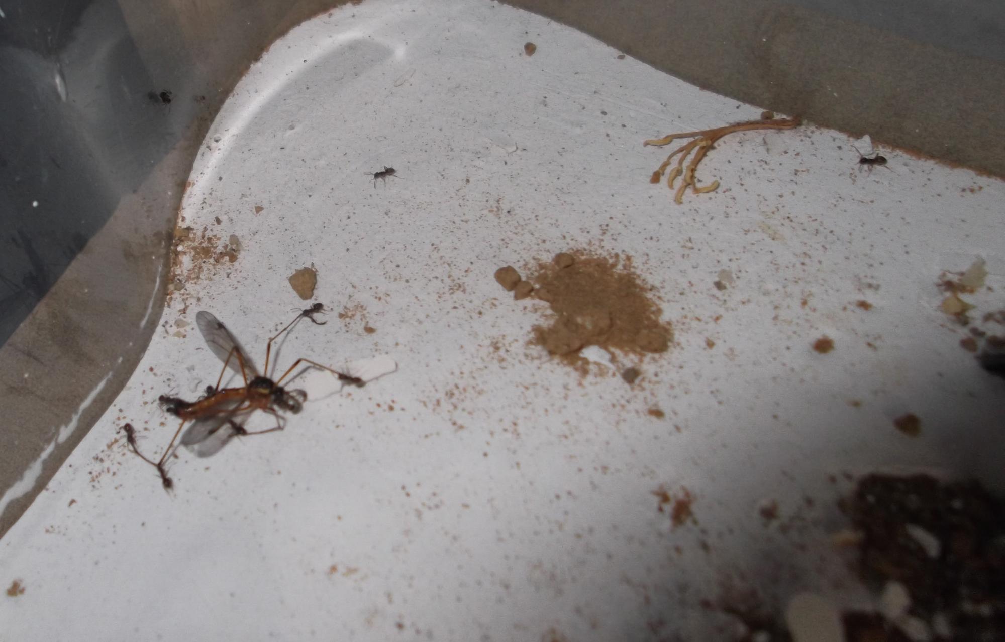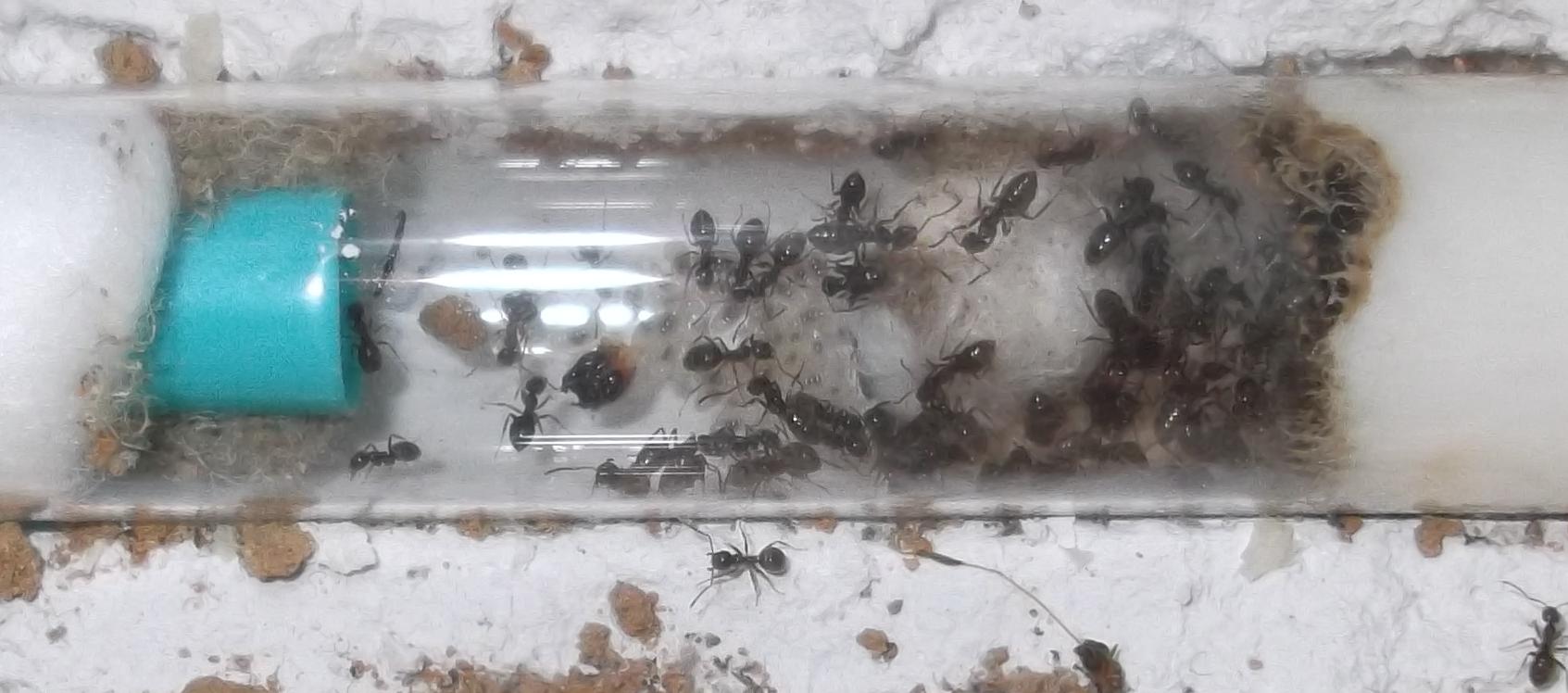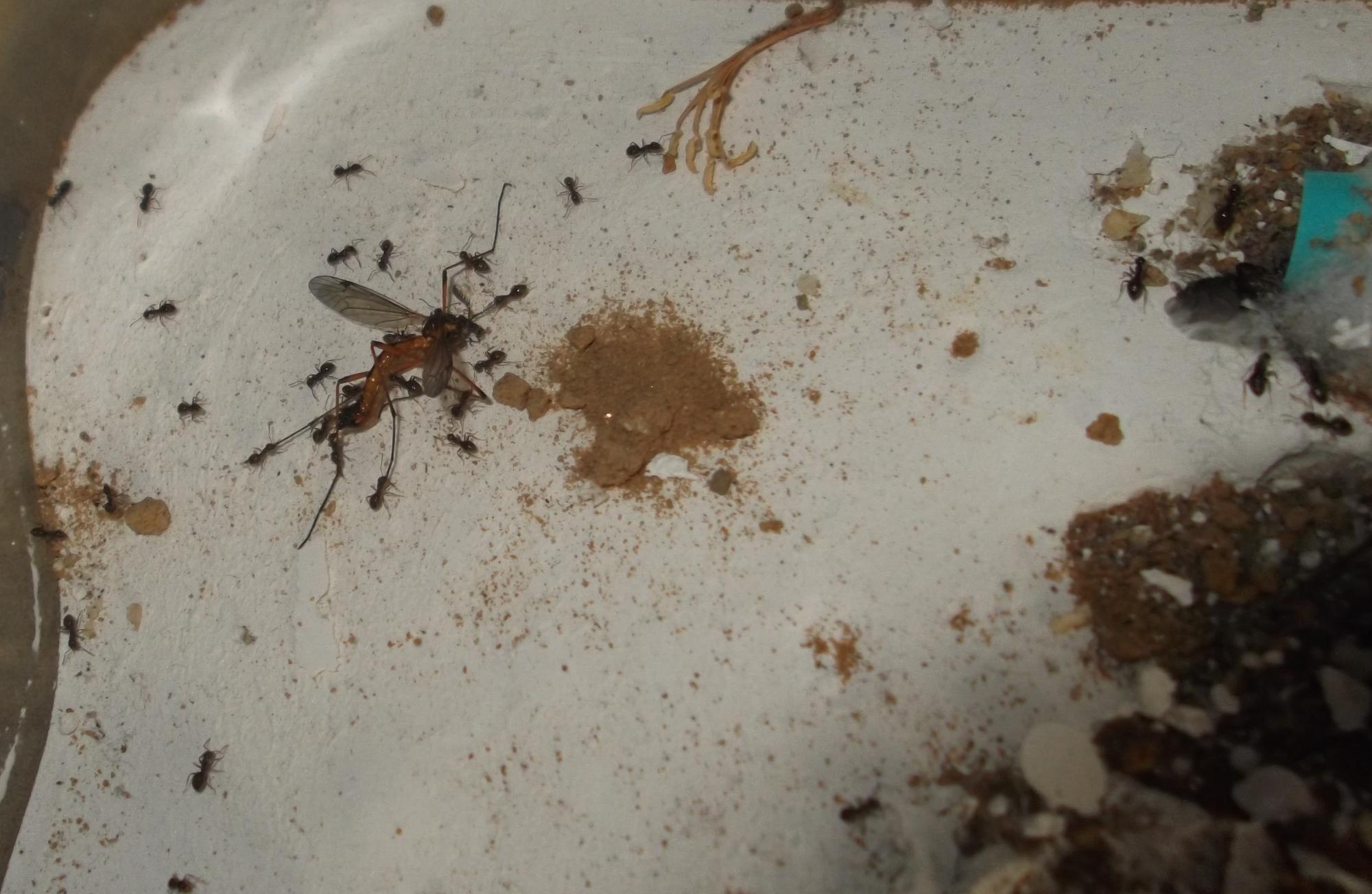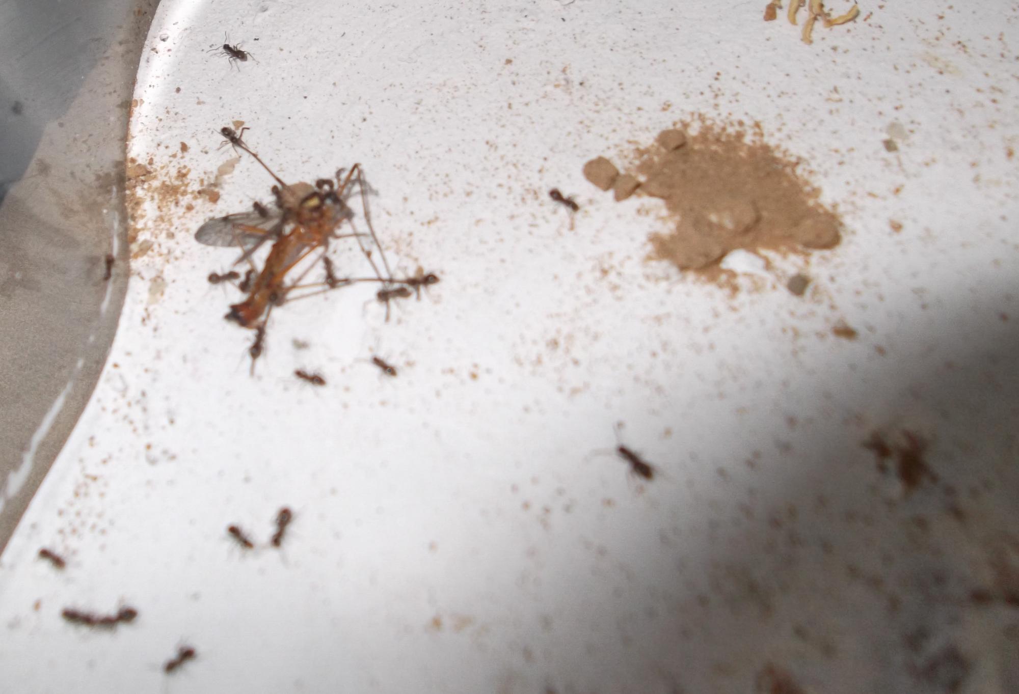 Und noch eine Paradigmenwechsel herbeiführende Beobachtung: bisher hatte ich immer angenommen, daß ein Strohhalm als Nestzugang die Ameisen nicht völlig zufrieden stellt, weil sie es oftmals nicht schaffen ein Futtertier hindurch ins Nest zu schleppen, sodaß es nur so weit es geht in den Eingang gestopft oder am Eingang abgelegt wird. In der Natur könnten sie den Eingang wahrscheinlich nach Bedarf vergrößern und wieder verkleinern. Nun aber in dieser Saison leben sie notgedrungen in einem ganz offenen Reagenzglas, sodaß die Öffnung für allerlei leckere Kadaver mehr als groß genug ist, und trotzdem werden die Futtertiere nicht ganz ins Glas transportiert, sondern am Eingang abgelegt.