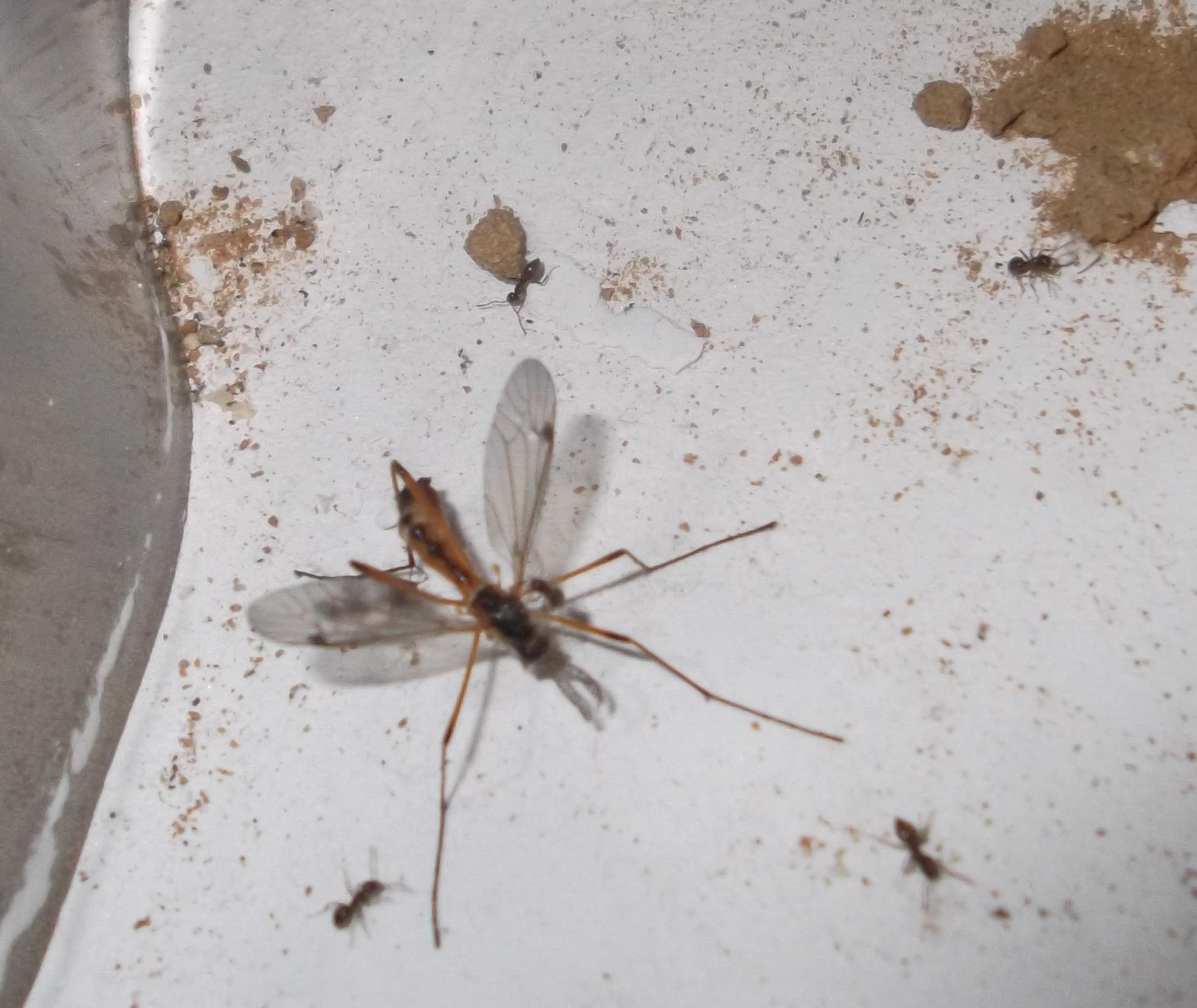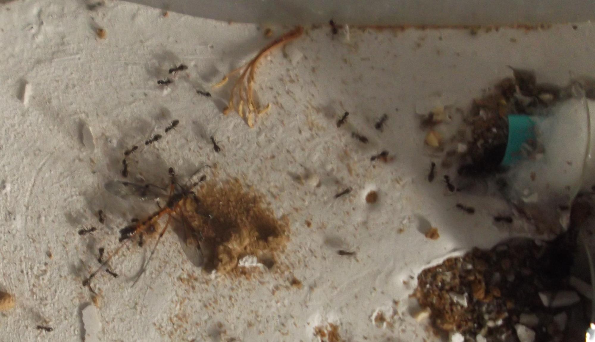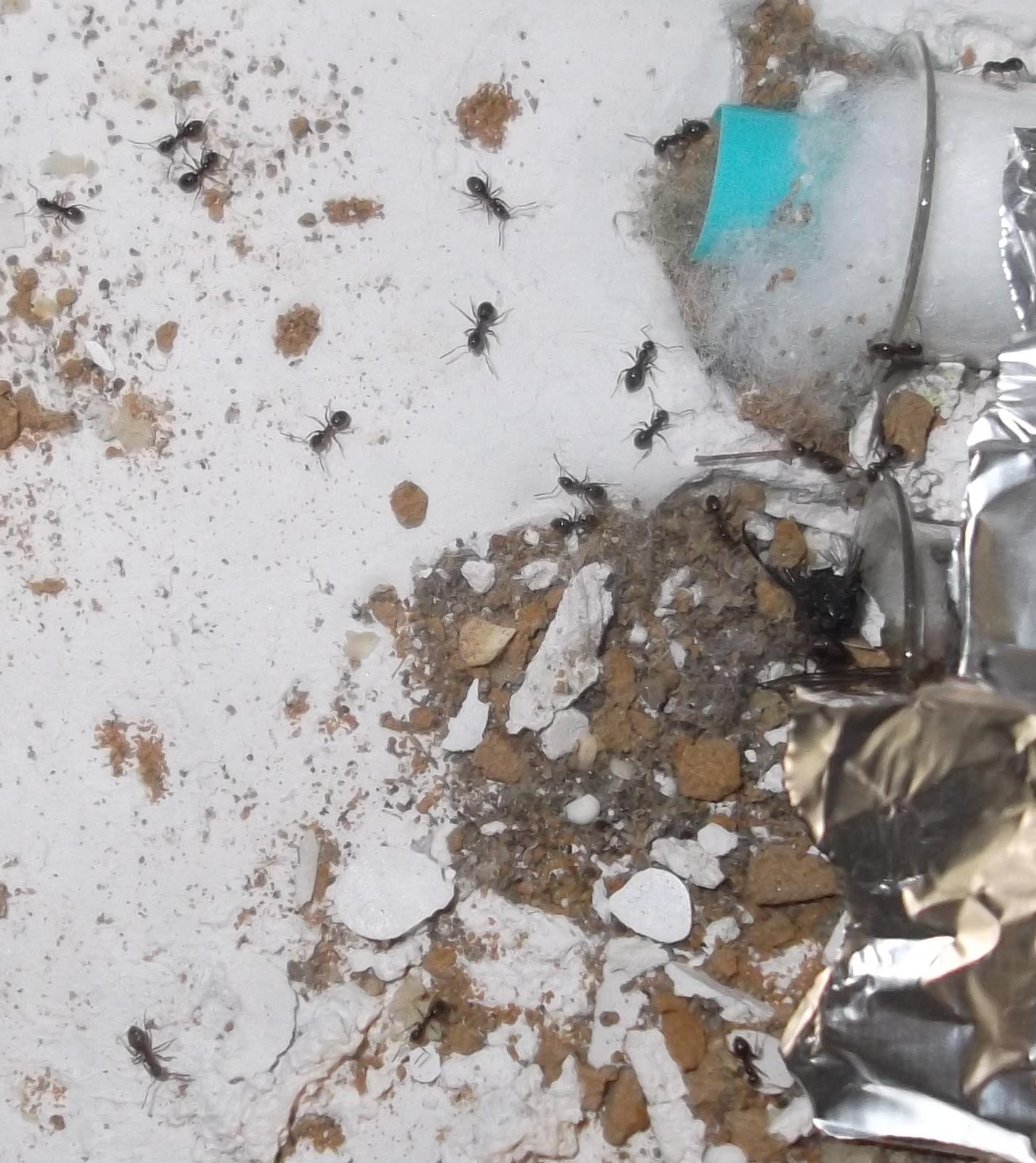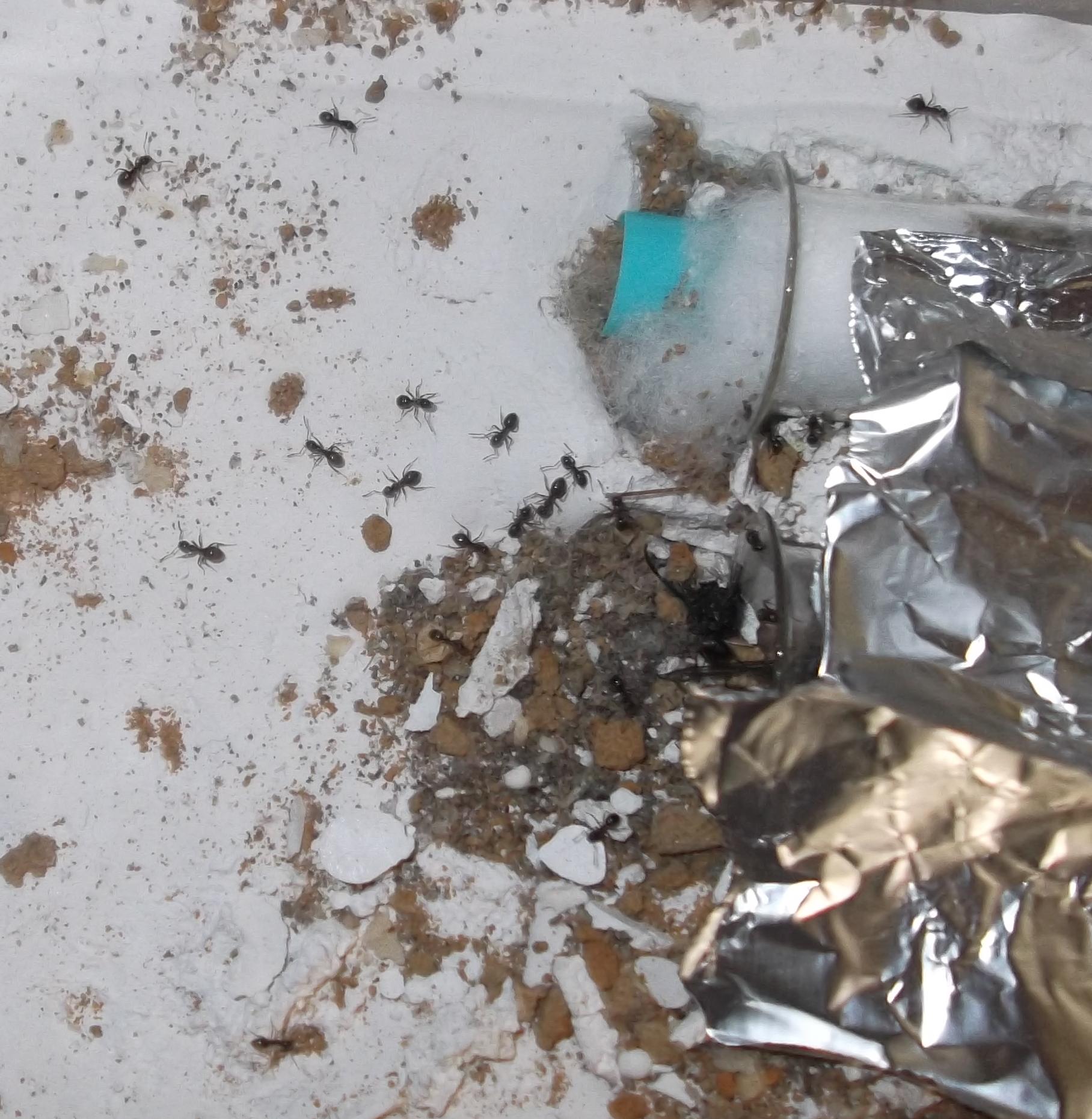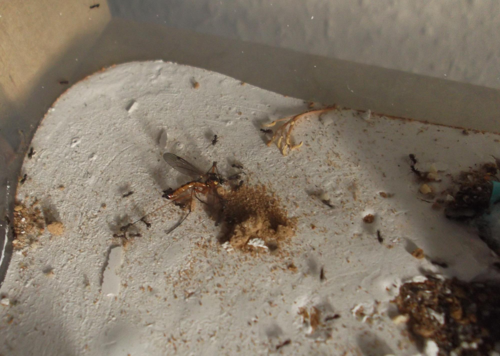 Und noch eine Paradigmenwechsel herbeiführende Beobachtung: bisher hatte ich immer angenommen, daß ein Strohhalm als Nestzugang die Ameisen nicht völlig zufrieden stellt, weil sie es oftmals nicht schaffen ein Futtertier hindurch ins Nest zu schleppen, sodaß es nur so weit es geht in den Eingang gestopft oder am Eingang abgelegt wird. In der Natur könnten sie den Eingang wahrscheinlich nach Bedarf vergrößern und wieder verkleinern. Nun aber in dieser Saison leben sie notgedrungen in einem ganz offenen Reagenzglas, sodaß die Öffnung für allerlei leckere Kadaver mehr als groß genug ist, und trotzdem werden die Futtertiere nicht ganz ins Glas transportiert, sondern am Eingang abgelegt.