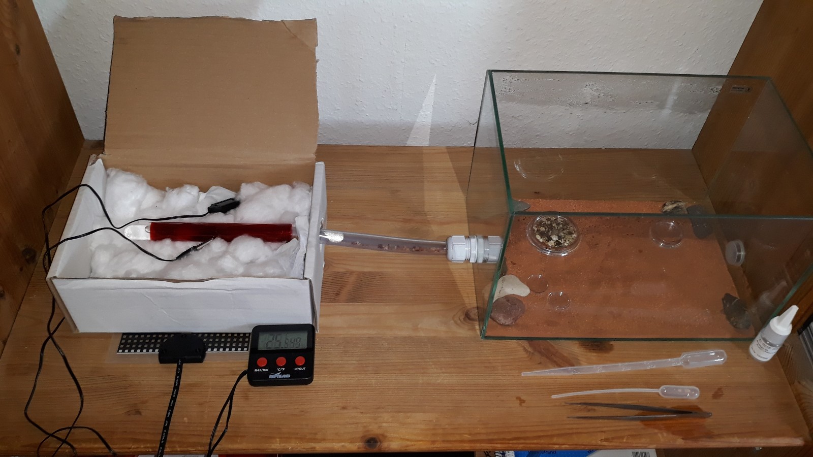Naja, und heute kam zum Glück endlich die Heizmatte, denn die Messoren sind immer noch inaktiv. Als ich nach ihnen geschaut habe, saßen sie alle ganz dicht beieinander, alle direkt vor der feuchten Watte und eng zusammen. Die Heizmatte habe ich erstmal unter die Pappschachtel geschoben, ich hoffe das geht so in Ordnung. Es handelt sich um diese hier in der 5W Version, 14x15 cm: https://www.amazon.de/gp/product/B00CWS ... UTF8&psc=1.