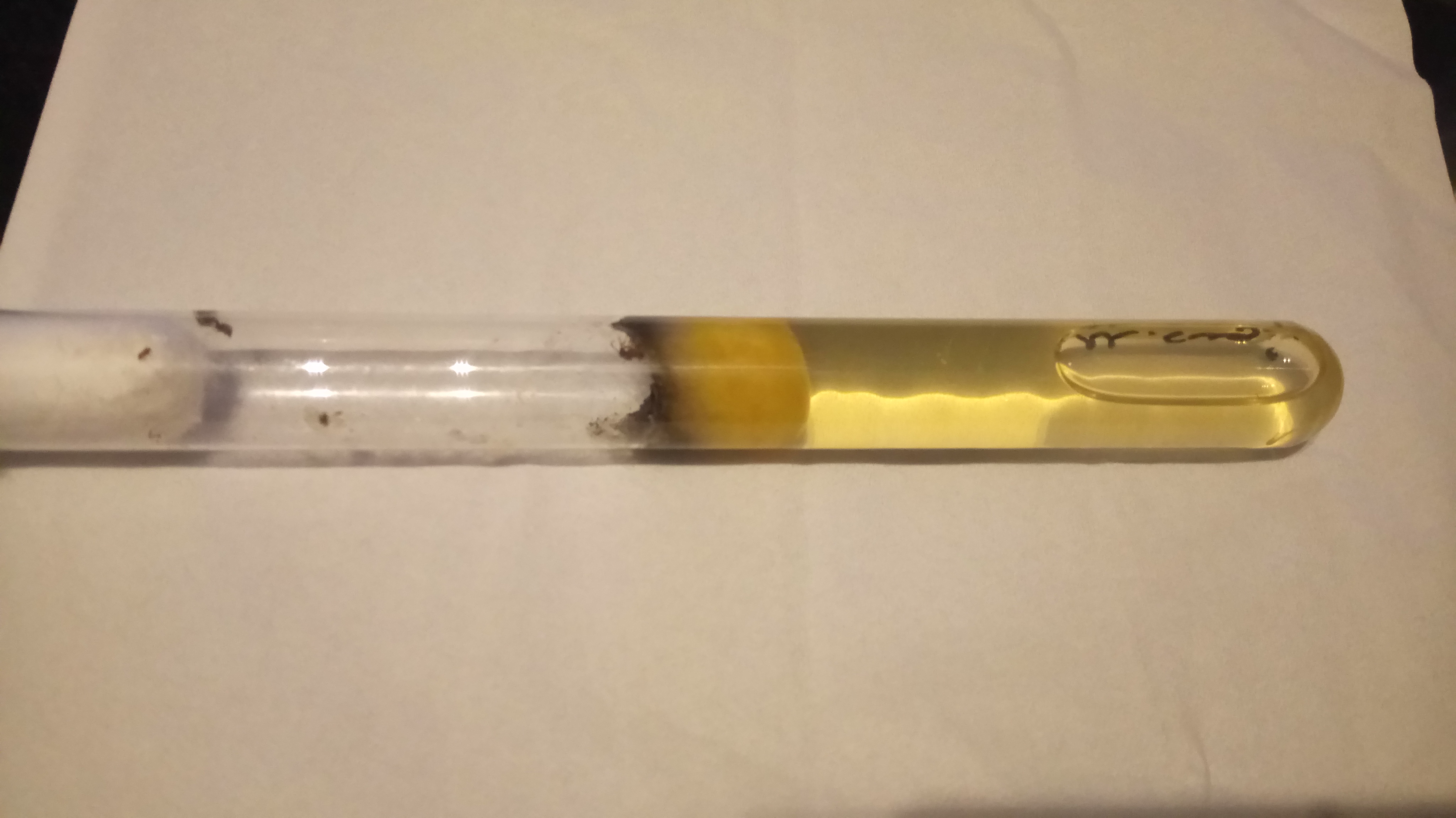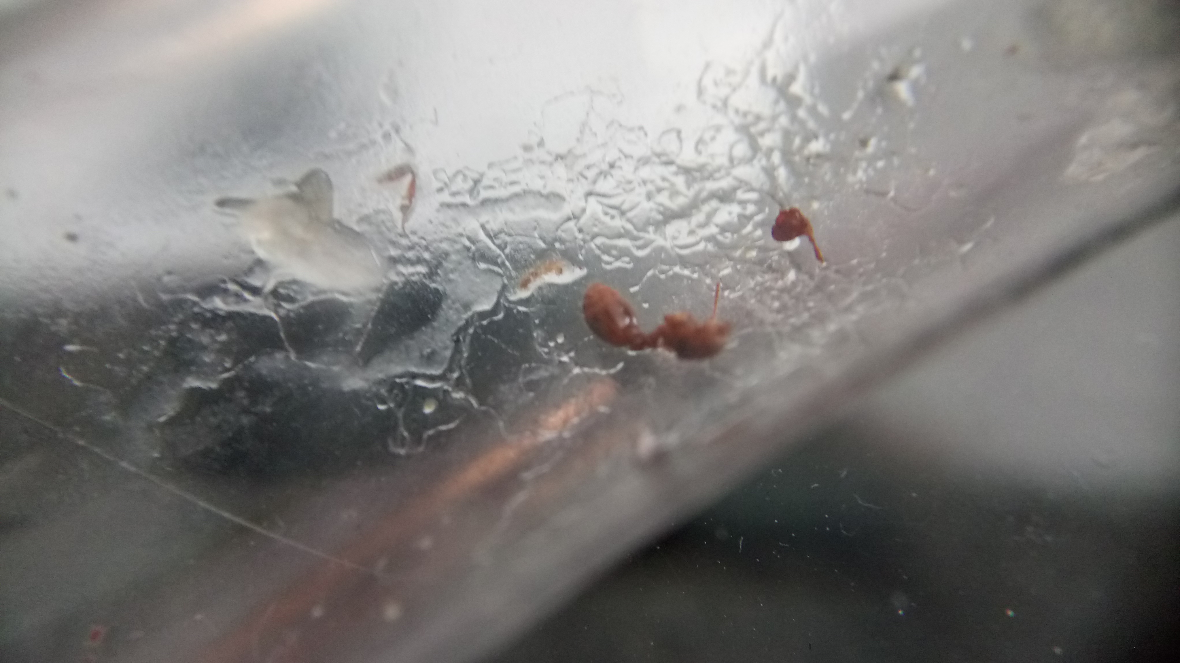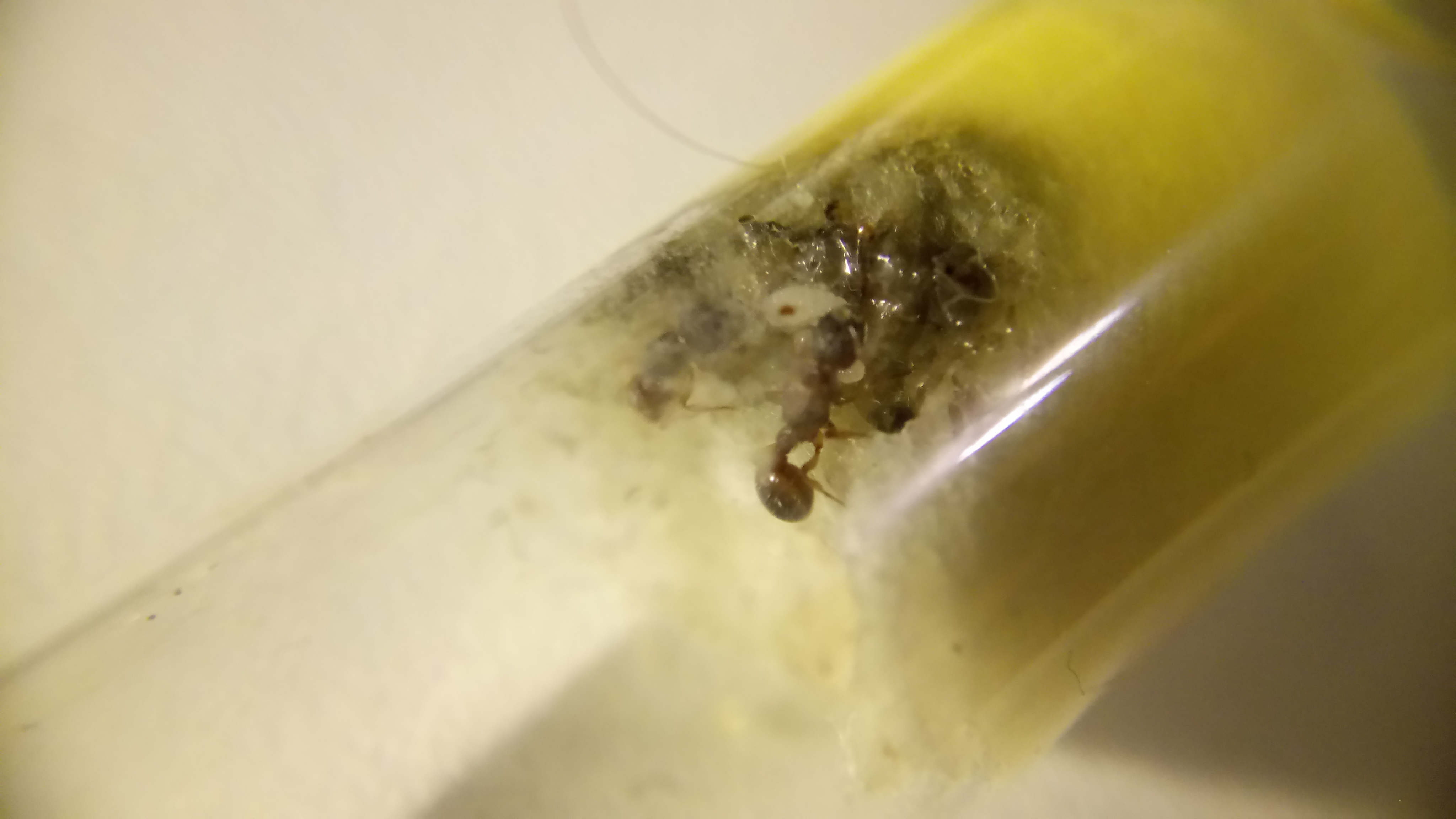 Auch nach Wochen wollten sie das Reagenzglas nicht verlassen, erst als der Tank leer war, wurde ein neues akzeptiert. Die zwei kurzzeitig vorhandenen Arbeiterinnen sind verstorben, bald darauf dieGyne . Auch hier fand ich massenhaft Milben im Reagenzglas vor.