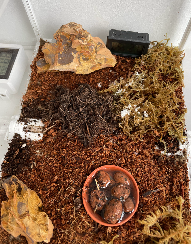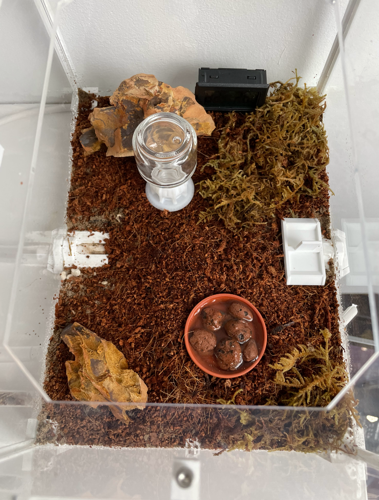 Ich habe erstmal ein Granulat rein und dann ein bisschen Sand-Lehm-Humus Mischung. Ich möchte vermeiden das sie hier erfolgreich graben können: Danach habe ich noch etwas "Wald" rein gebracht und versucht die Farbe von dem Bodengrund zu verändern das ich sie hoffentlich besser erkennen kann. Nun sieht es so aus: Ich versuche aktuell auch gerade Springschwänze und Asseln anzusiedeln aber das ist mal gar nicht so leicht ohne sich die ganze Arena zu "versauen": Habe die Asseln tatsächlich einzeln raus ziehen müssen und die Springschwänze hängen da an den Fasern. Ich hoffe das es klappt das so eine kleine Gruppe sich vermehren wird. Sie sollen als Bodenopolizei dienen und die Asseln ggf. als kleinen Snack