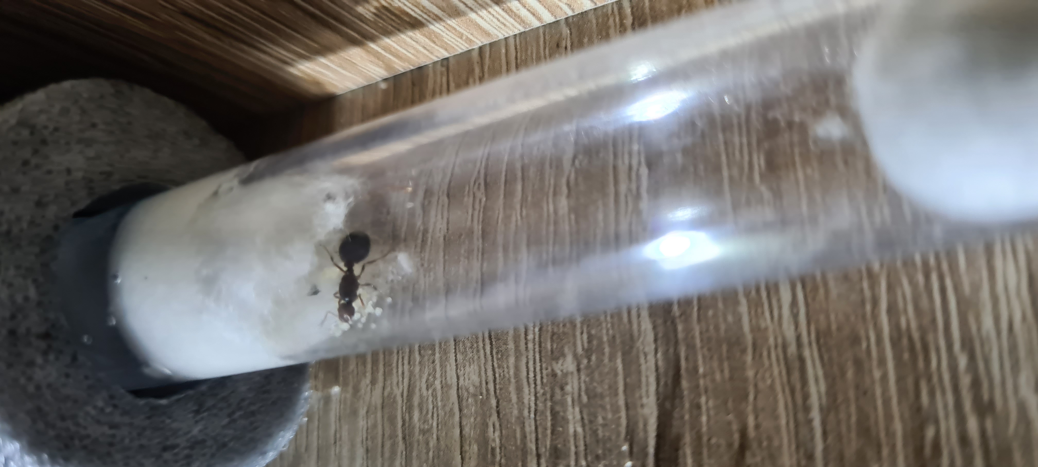Hab die Kolonie jetzt in ein 20x10cm formicarium gesetzt das sollte fĂŒr den Anfang reichen dazu noch eine neue trĂ€nken ,einen Tropfen Honig und ein StĂŒck schockoschabe