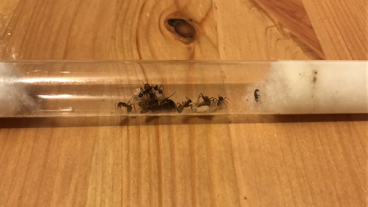 In das wassertanklose Reagenzglas ist nun die gesamte Kolonie eingezogen. Es stimmt also, dass diese Art sehr trockenliebend ist.