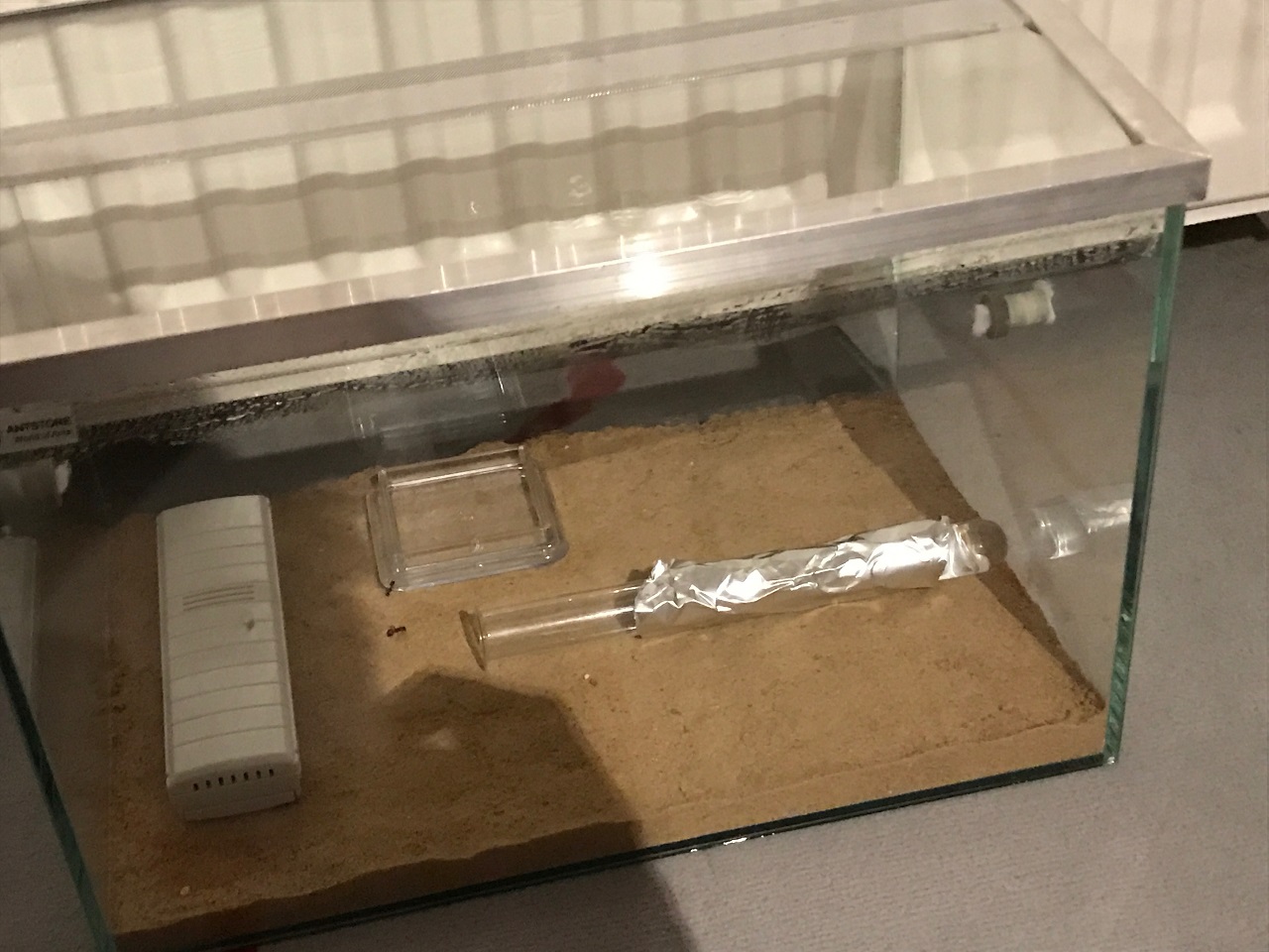 Als Übergangslösung habe ich ein kleines Glasbecken mit einem Sand-Lehm Boden vorbereitet. Etwas Wasser auf das Sand-Lehm Gemisch, trocknen lassen und fertig ist ein harter perfekter Boden. In dieses Becken soll das Reagenzglas (im folgenden Bericht mit "RG" abgekürzt) mit den Ameisen reingelegt werden, dieses dient dann auch gleich als Wasserquelle. Als Ausbruchsschutz wird Paraffinöl verwendet. Als Futternapf habe ich eine kleine Plastikschale in das Becken gelegt. Deko wird es in diesem Becken noch nicht geben. Beheizt wird das Becken mit einer kleinen Heizmatte, die das Becken auf bis zu 35 Grad erhitzen kann, mein Dimmer hält die Matte aber in Schach.