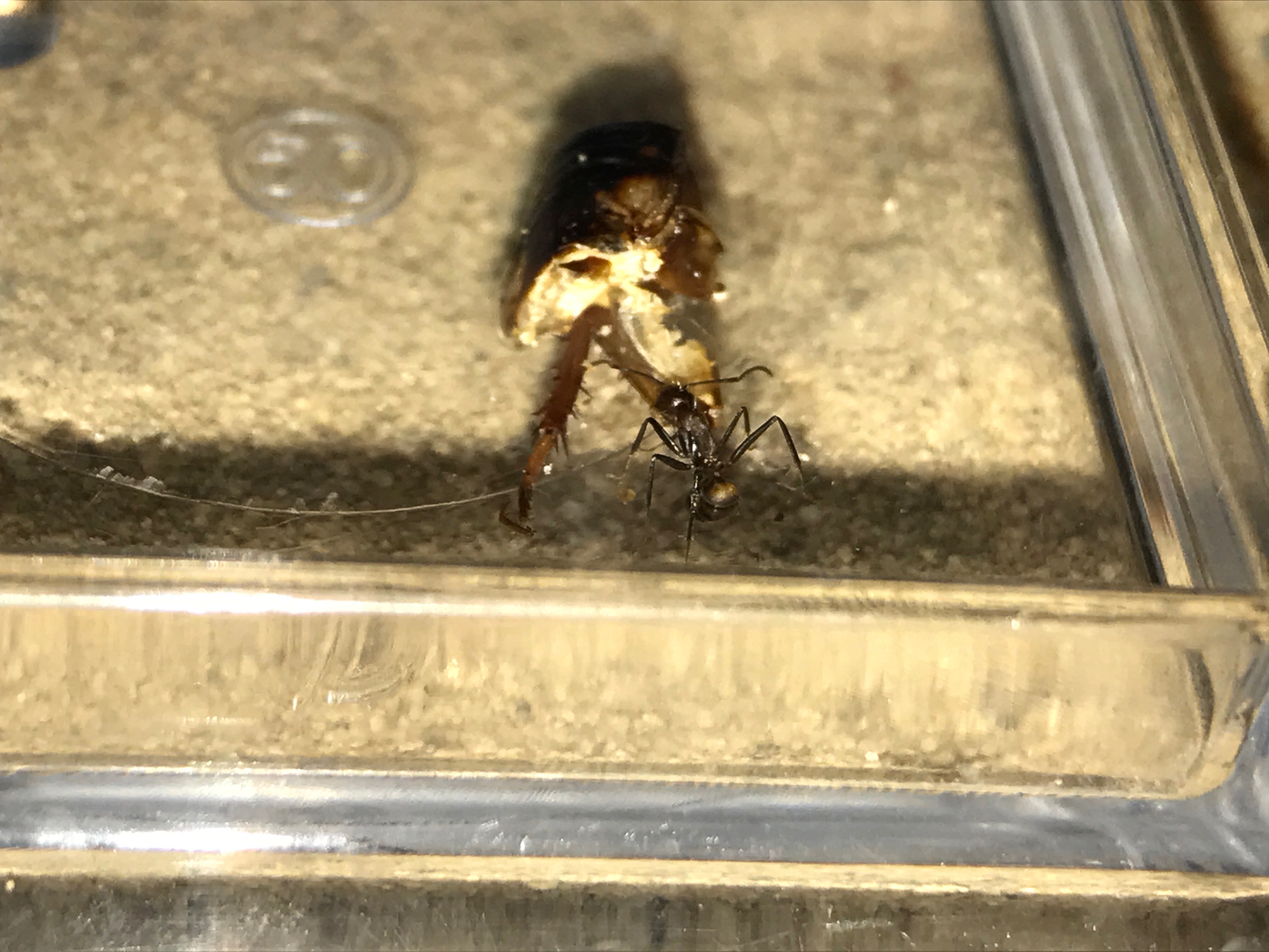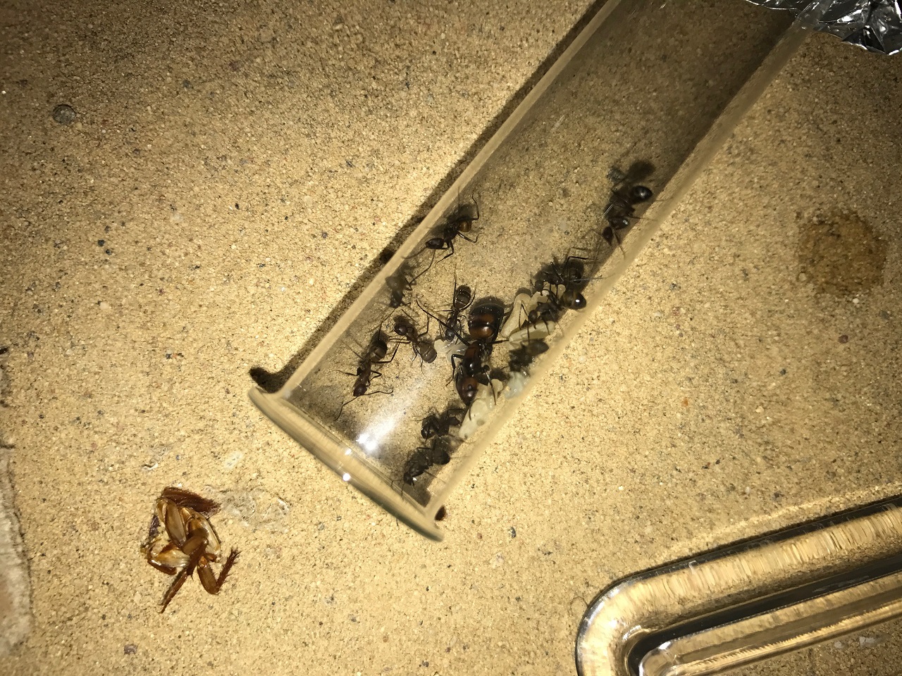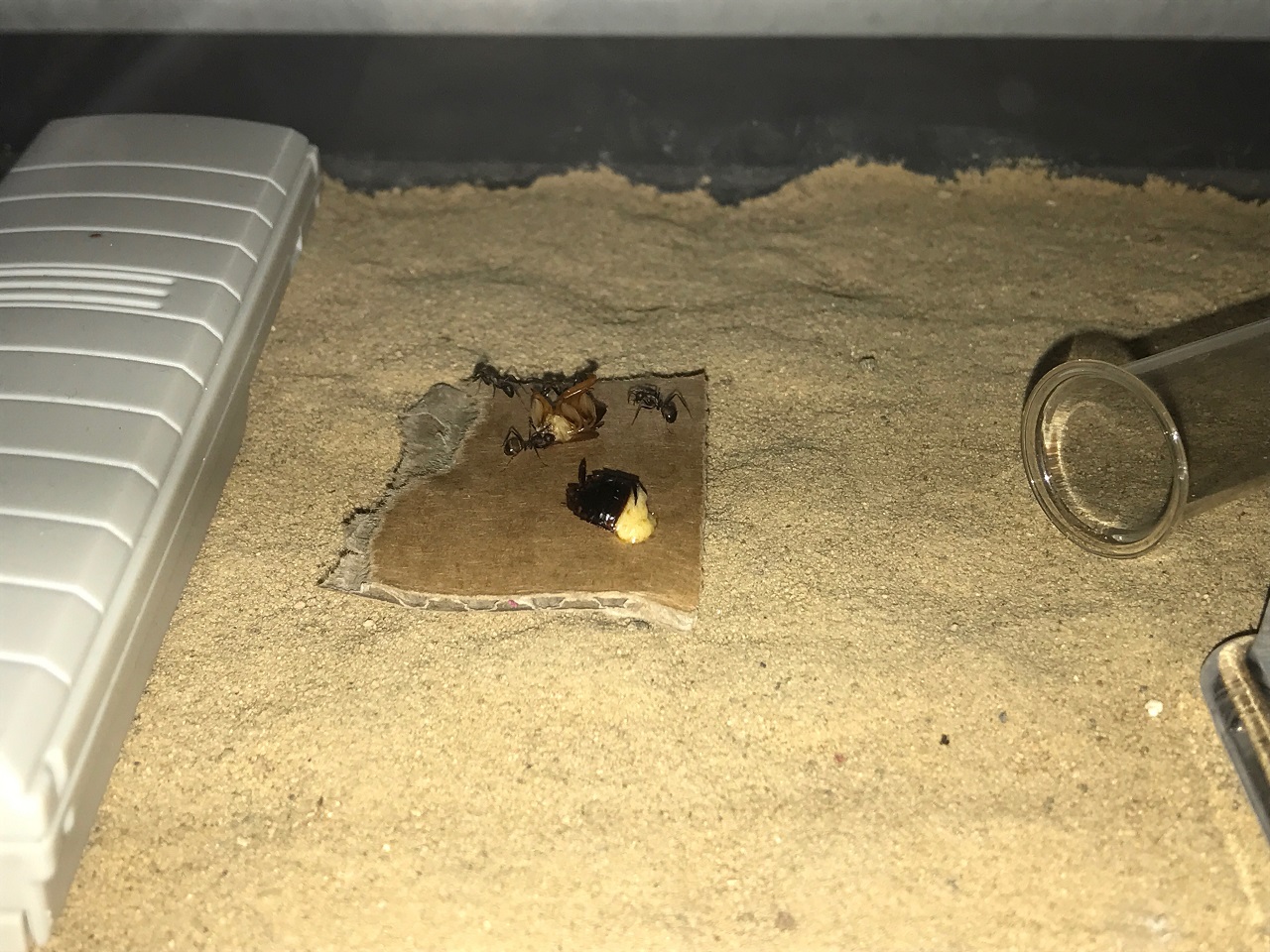 In der Zwischenzeit habe ich festgestellt, dass die C.n. tatsächlich nachtaktiv sind und habe sie deshalb nur noch am Abend gegen 19 Uhr gefüttert. So auch gestern Abend. Mit einer Pinzette habe ich eine Schabe gepackt, sie geköpft und noch einmal halbiert, damit die Ameisen sich nicht erst du den Chitinpanzer schneiden müssen. Die beiden Körperhälften habe ich auf ein Stück Karton gepackt und den Ameisen angeboten. Ich habe damit gerechnet das die Ameisen die Schabe gerne essen werden, mit der mir gezeigten Begeisterung habe ich allerdings nicht gerechnet. 8 von inzwischen 10 Arbeiterinnen haben sich auf die Schabe gestürzt und begonnen sie zu verspeisen. Scheinbar fahren sie total auf sie ab, ich habe also die richtige Wahl getroffen.