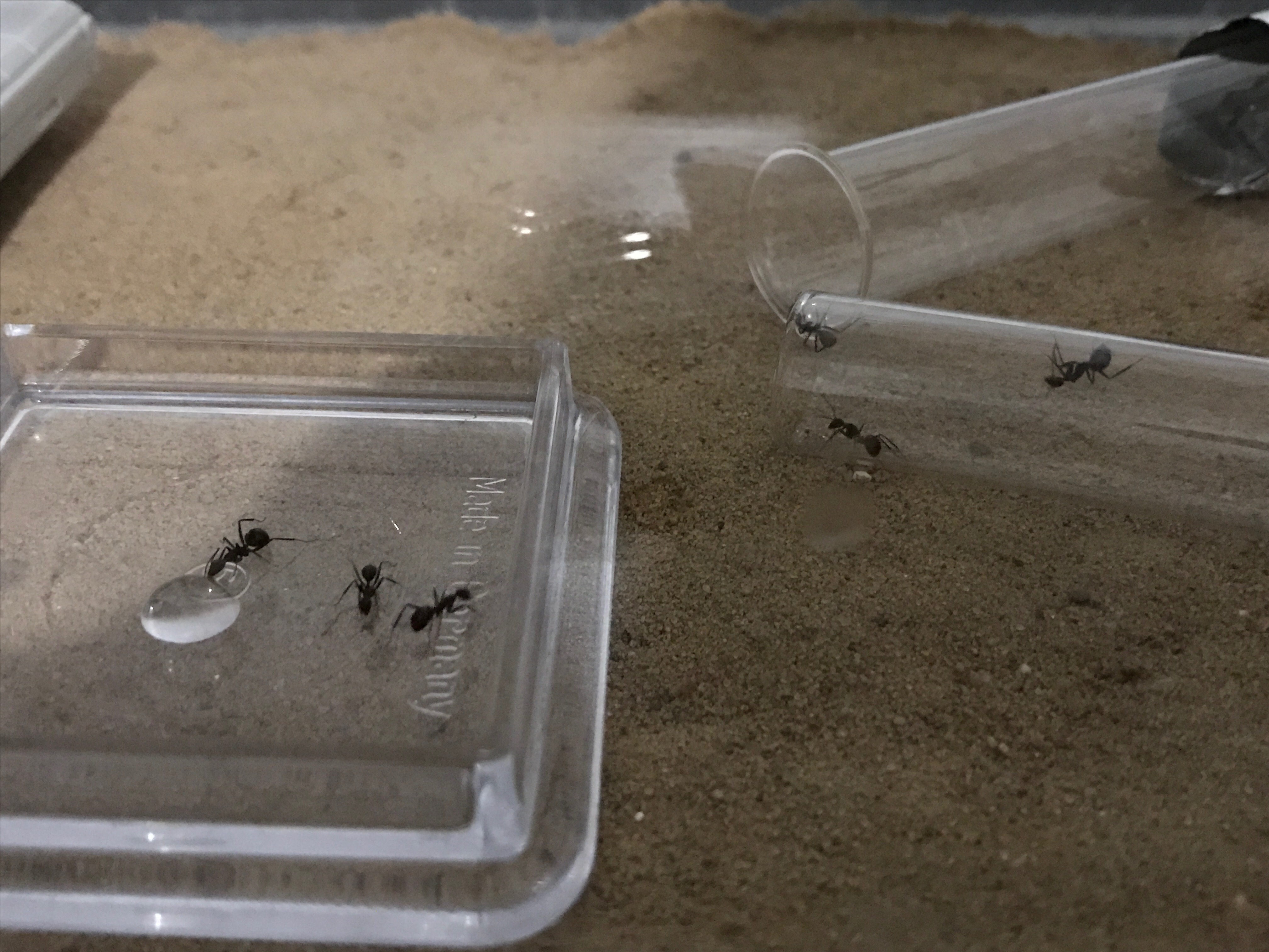 Das Reagenzglas mit dem Wassertank lasse ich aber trotzdem in der Arena, da sie ja eine Wasserquelle brauchen. Es sind auch oft 1-2 Arbeiterinnen dort drin, um Wasser aufzunehmen.