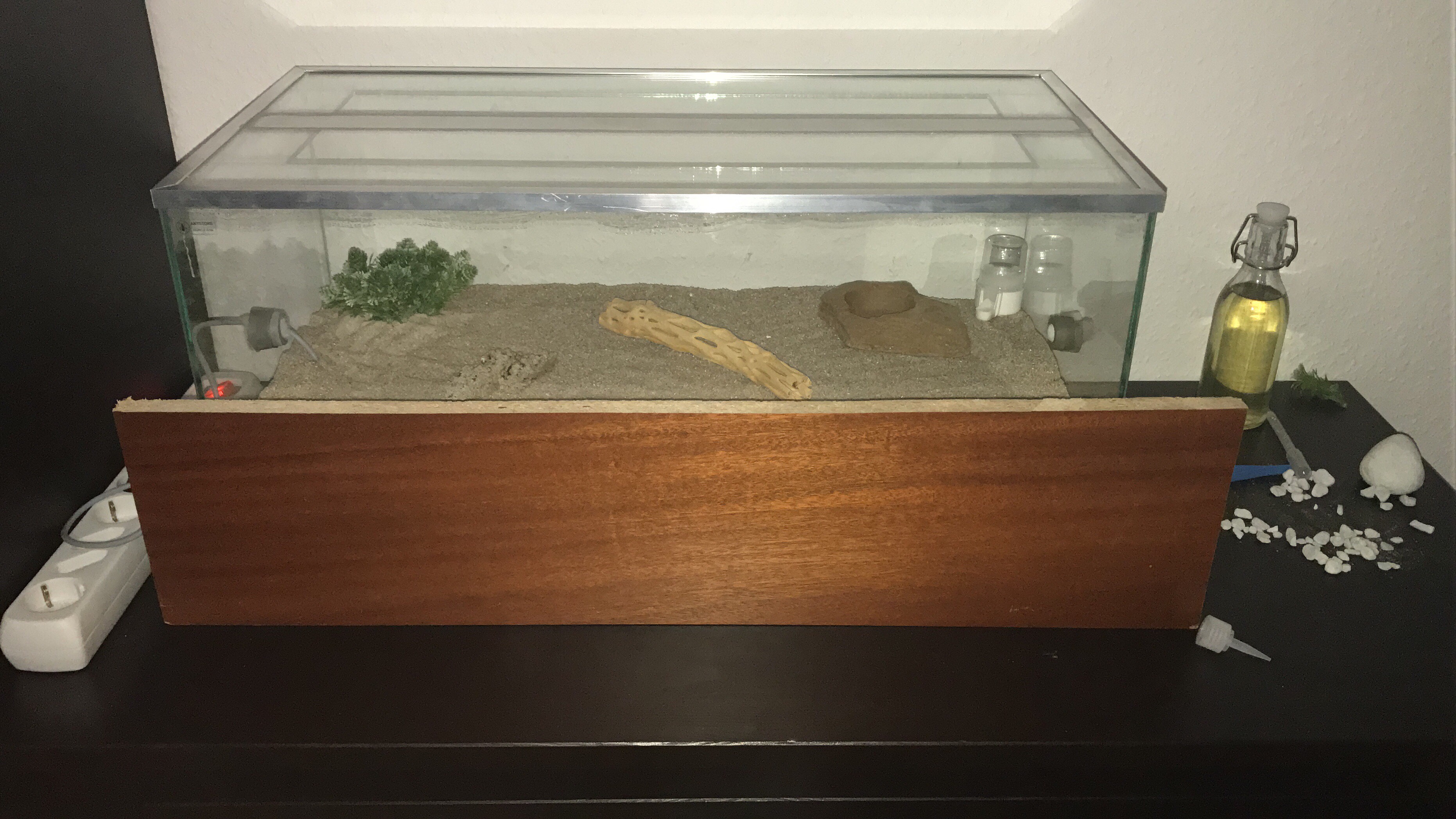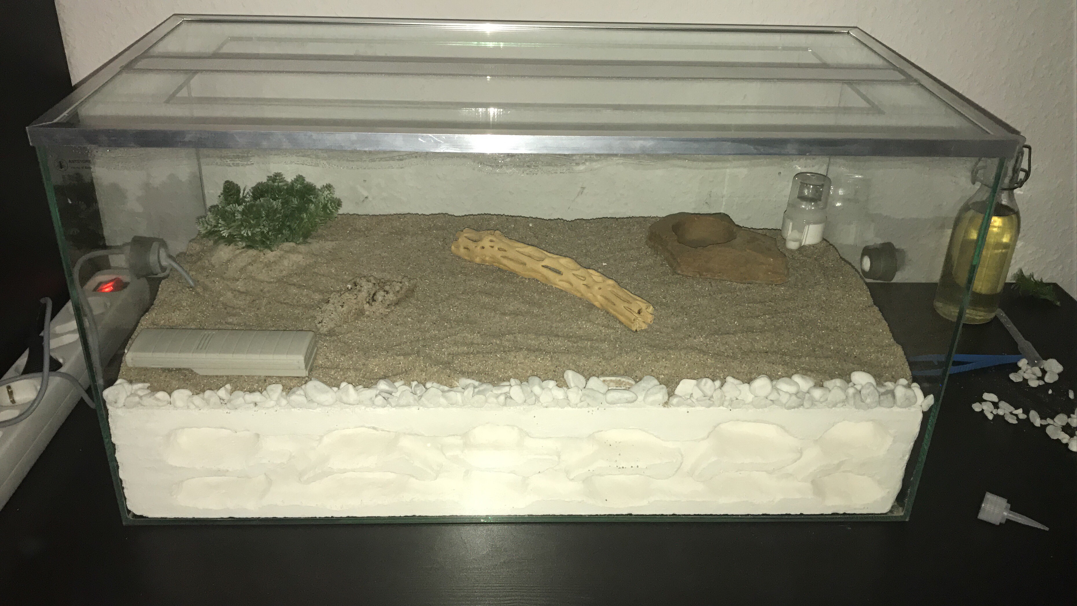 Das neue Becken hat die Maße 60x30x30 und beinhaltet ein Ytong-Nest. Beheizt wird das ganze mit einem Heizkabel. Nachfolgend seht ihr ein paar Bilder vom Becken: