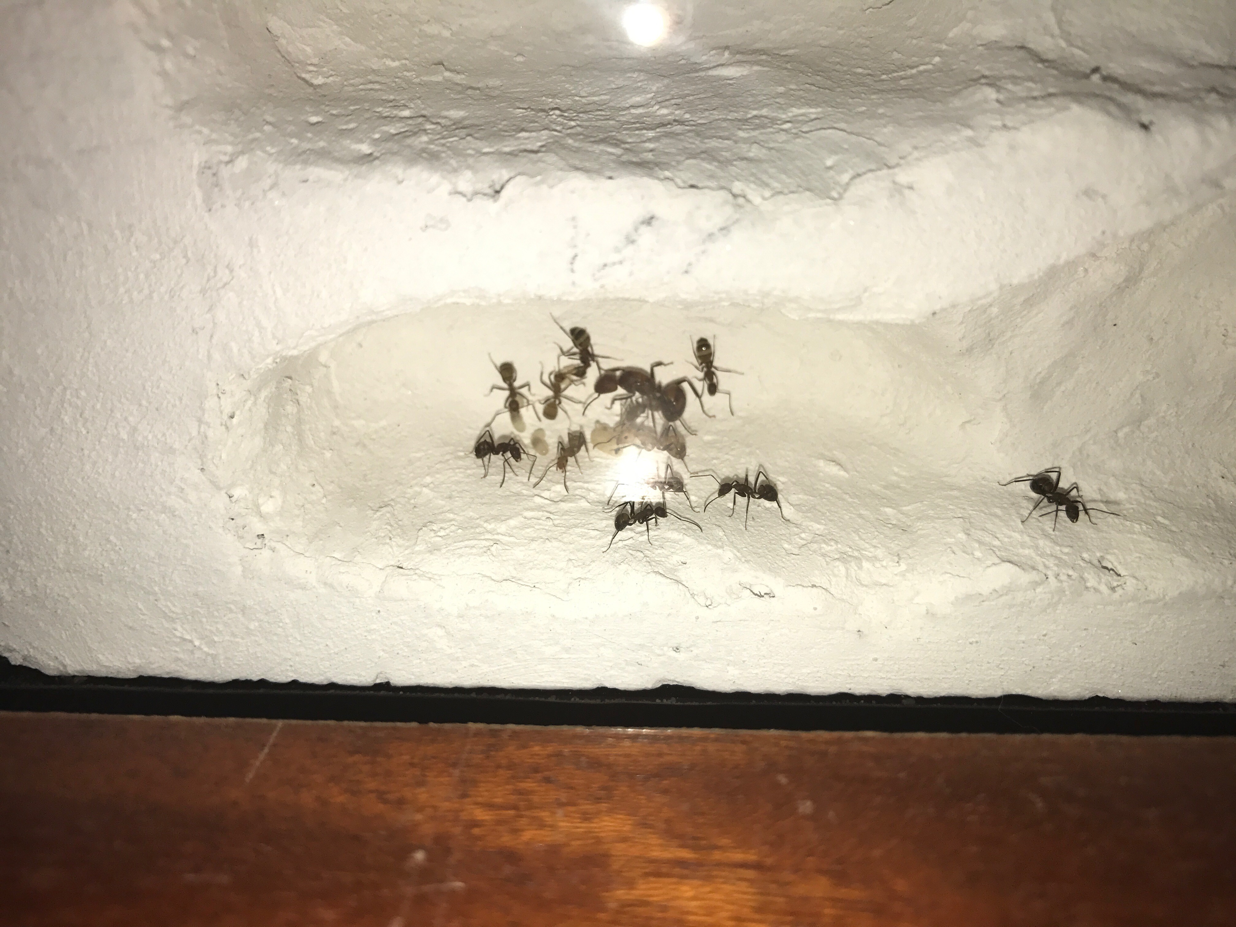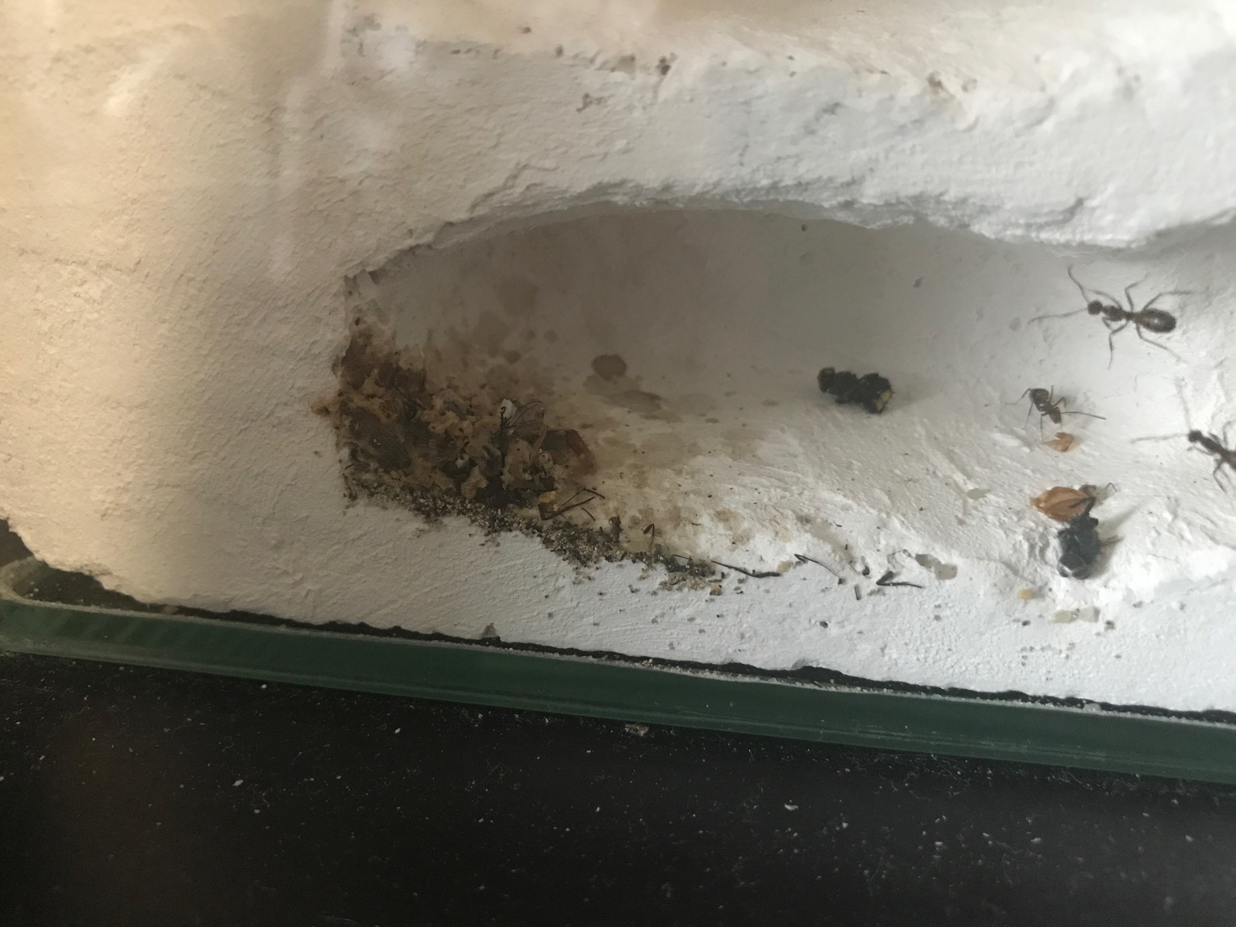 Außerdem habe ich auf der rechten Seite zwischen Ytong und Glasbecken einen winzigen kleinen Spalt, der aber groß genug für die Ameisen ist. Bisher haben sich fünf Stück in die Lücke gequetscht und sind dort verendet. Ich habe keine Ahnung wieso sie das tun, ich muss aber auf jeden Fall handeln. Ich werde diesen Bereich wohl absichern, indem ich ein Stück Pappe in den Spalt schiebe. Sieht zwar hässlich aus, aber immerhin können so keine Ameisen mehr sterben. Nachfolgend ein Bild von der ersten Selbstmörderin: