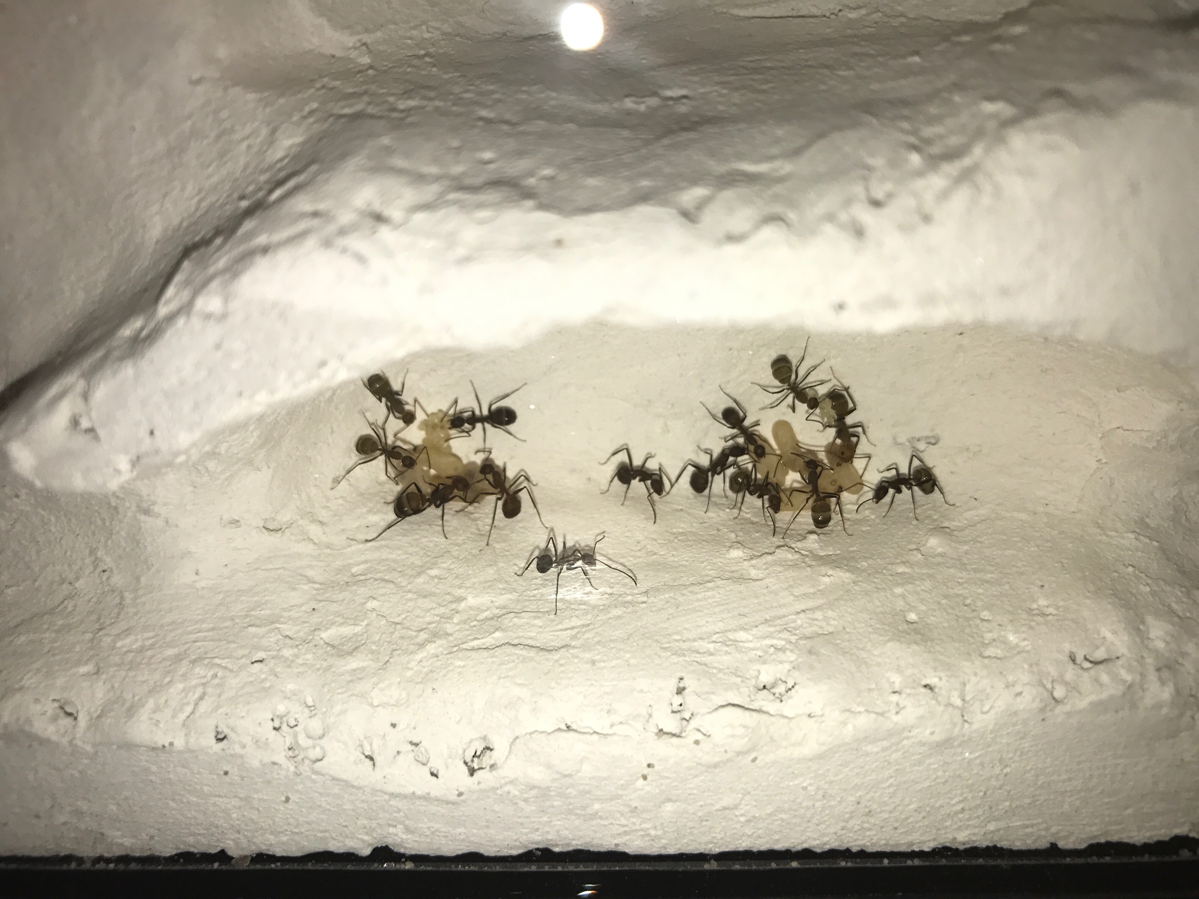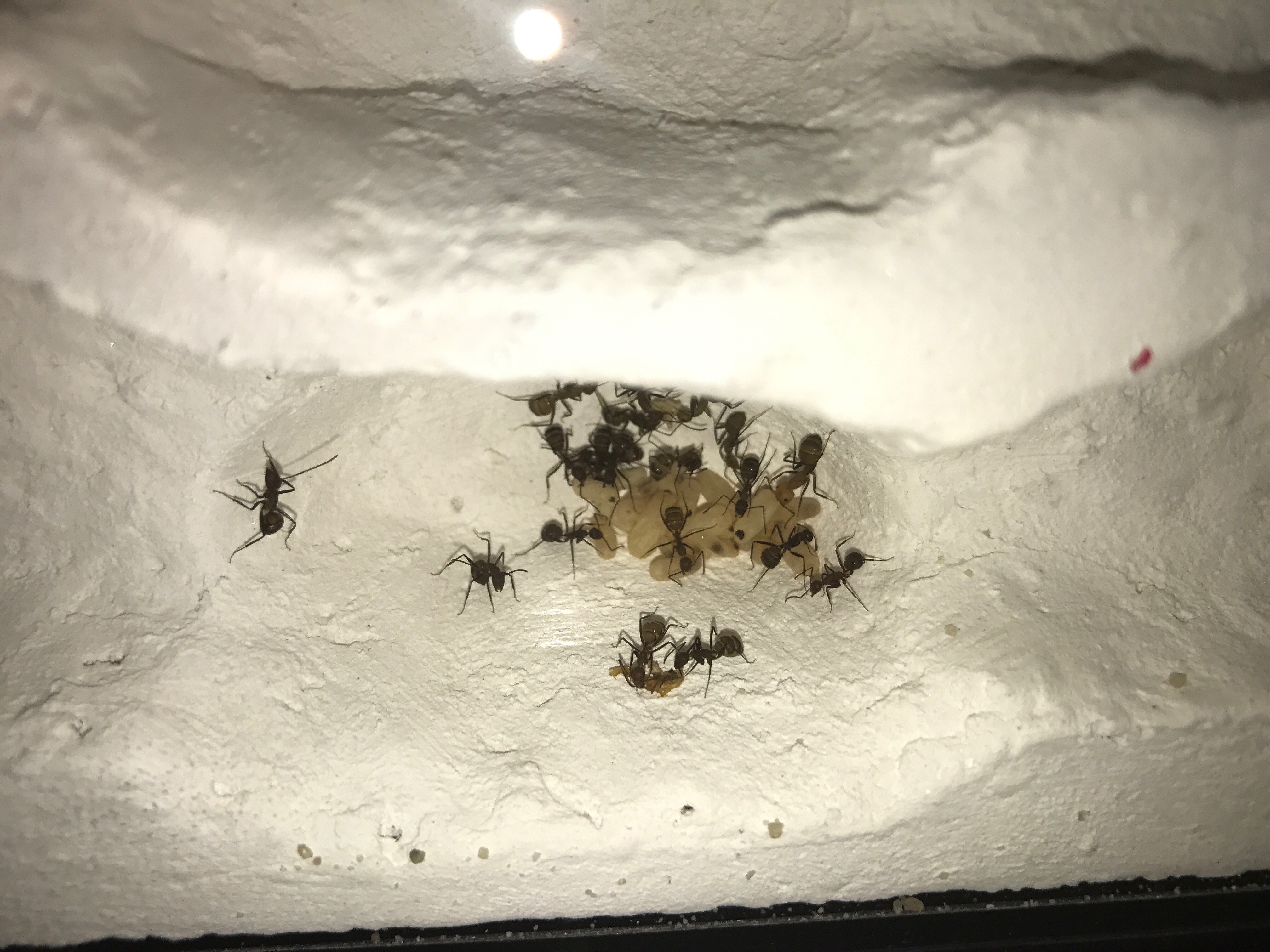 Mittlerweile sind es ca. 17-18 Ameisen, vorgestern habe ich 3-4 Puppen gesehen, ein paar Larven und einen Haufen Eier :)