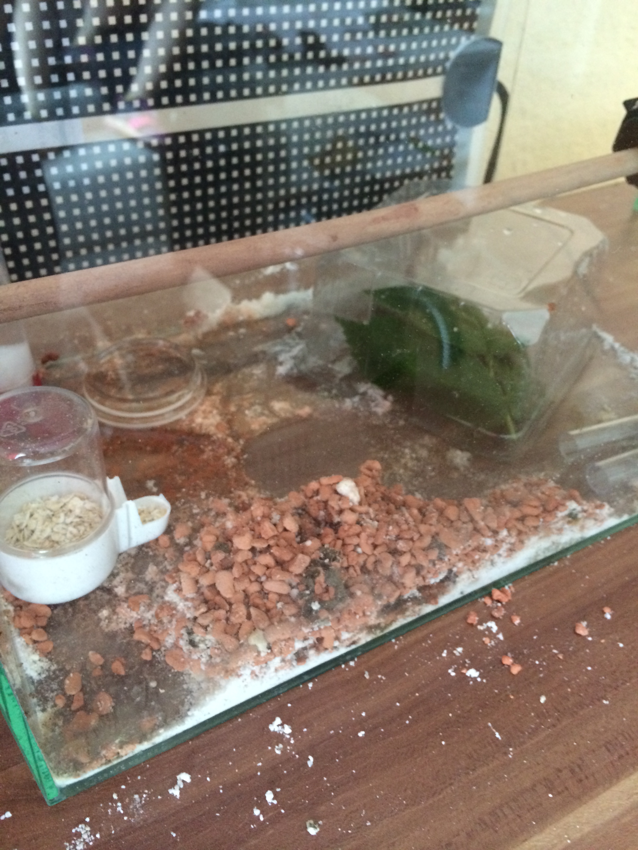 Eine Heimchenbox mit einem Loch hab ich befĂŒllt mit feuchten BlĂ€ttern ins Becken hinzugegeben. Desweiteren hab ich heute zur Sicherheit noch 2 Pilze bestellt.