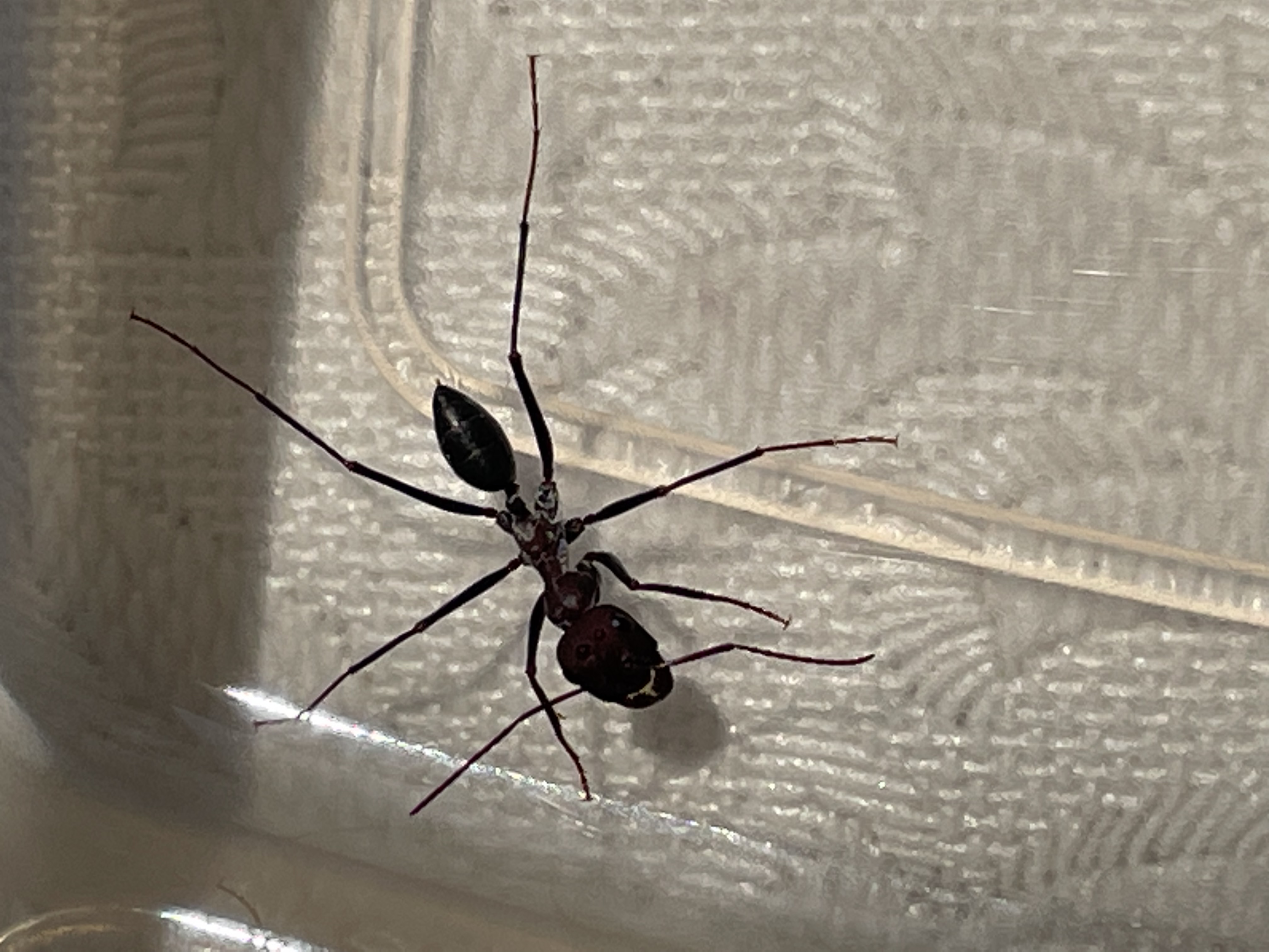 Die Ameise ist groß; Kopf und Thorax sind dunkelrot/brĂ€unlich gefĂ€rbt; der Gaster ist spitz und dunkel(schwarz). Beine sind sehr lang und am Ende auch dunkelrötlich gefĂ€rbt.