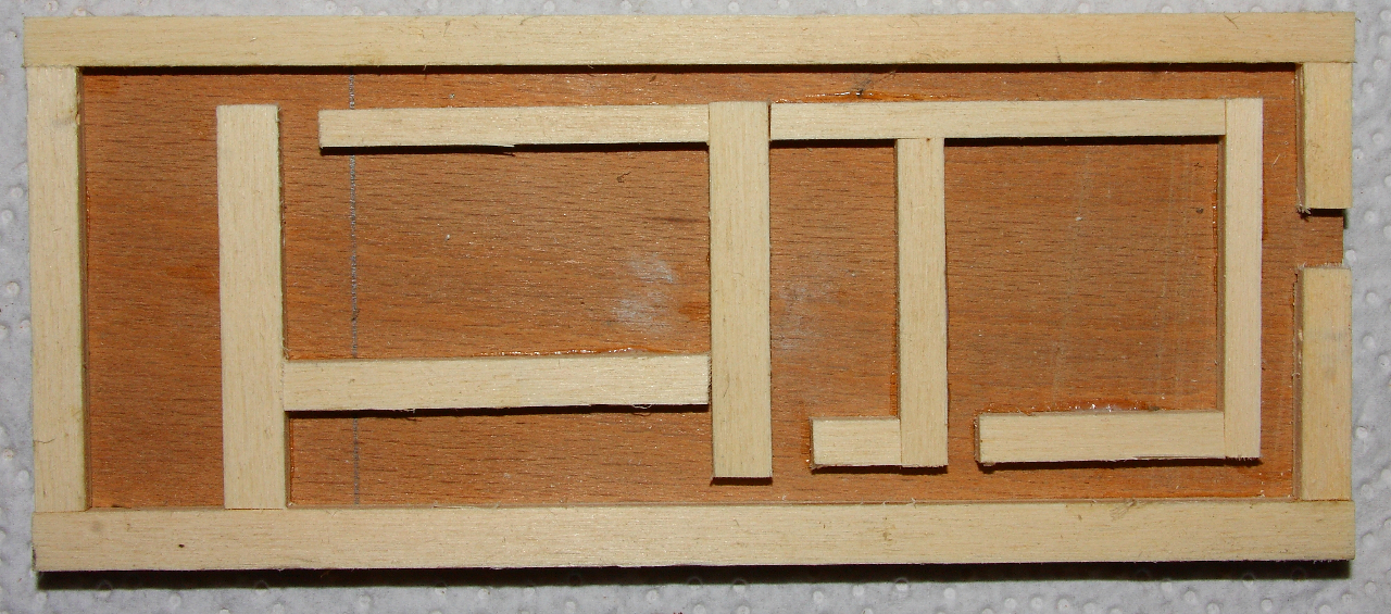 Verschieden breite Holzleistenstücke auf eine Holzplatte geklebt.